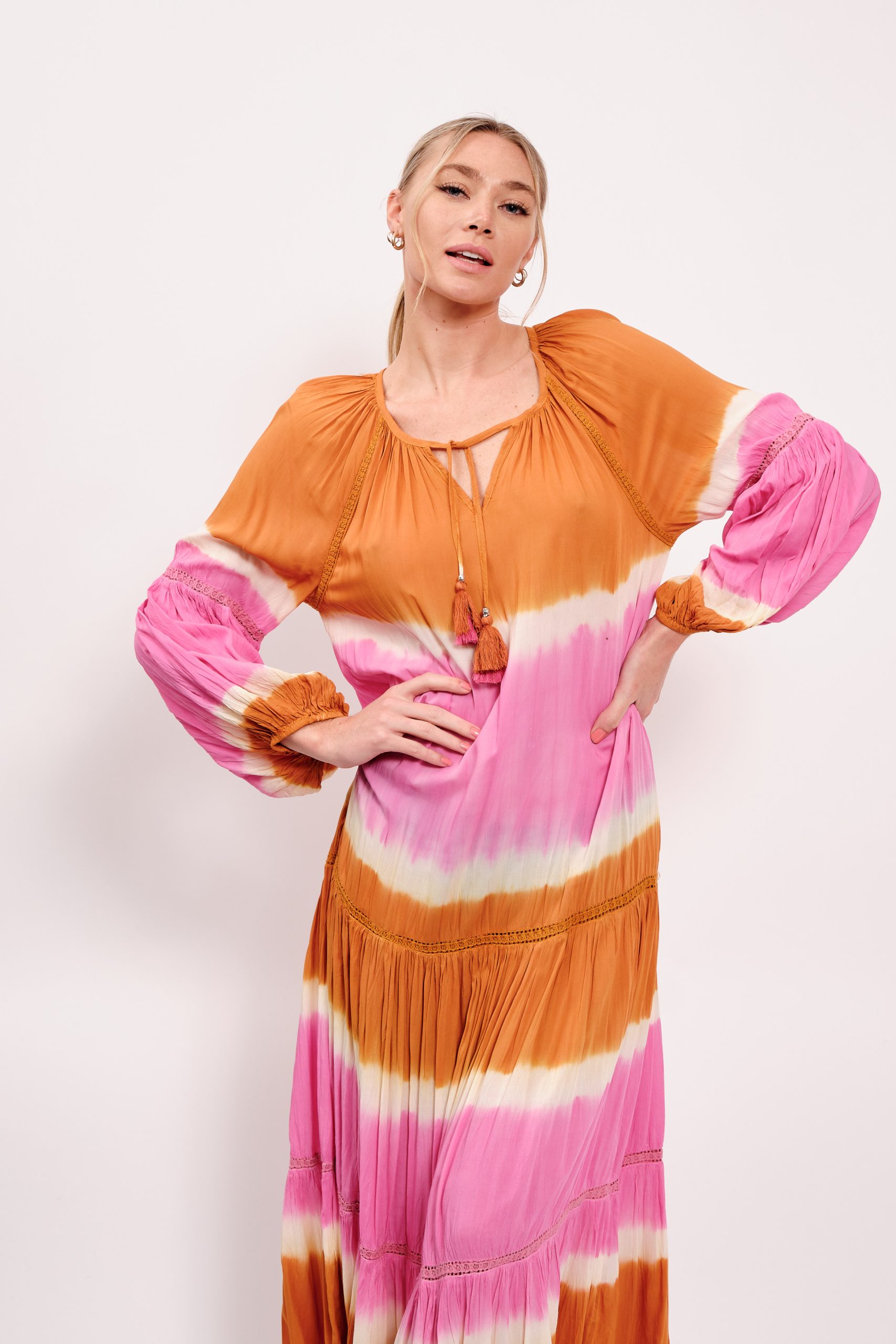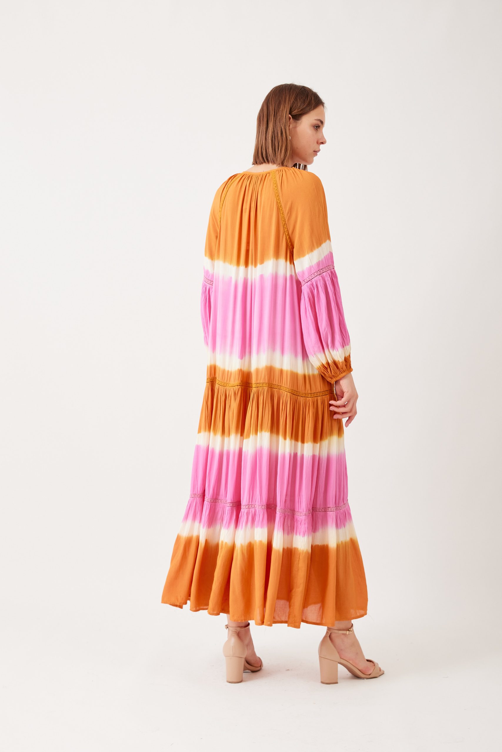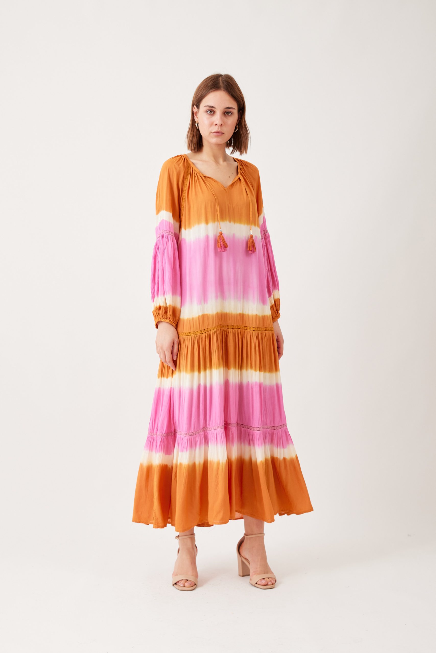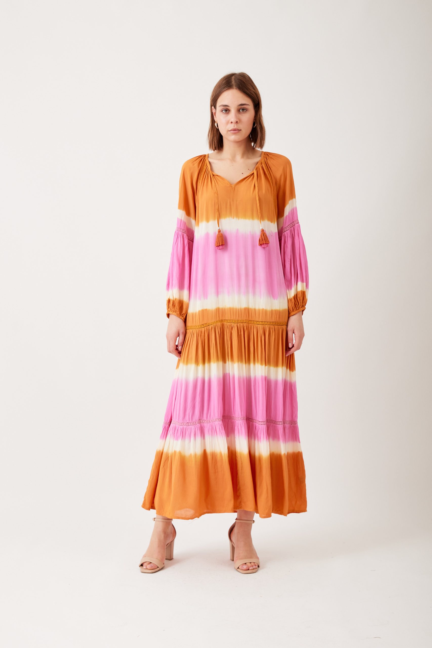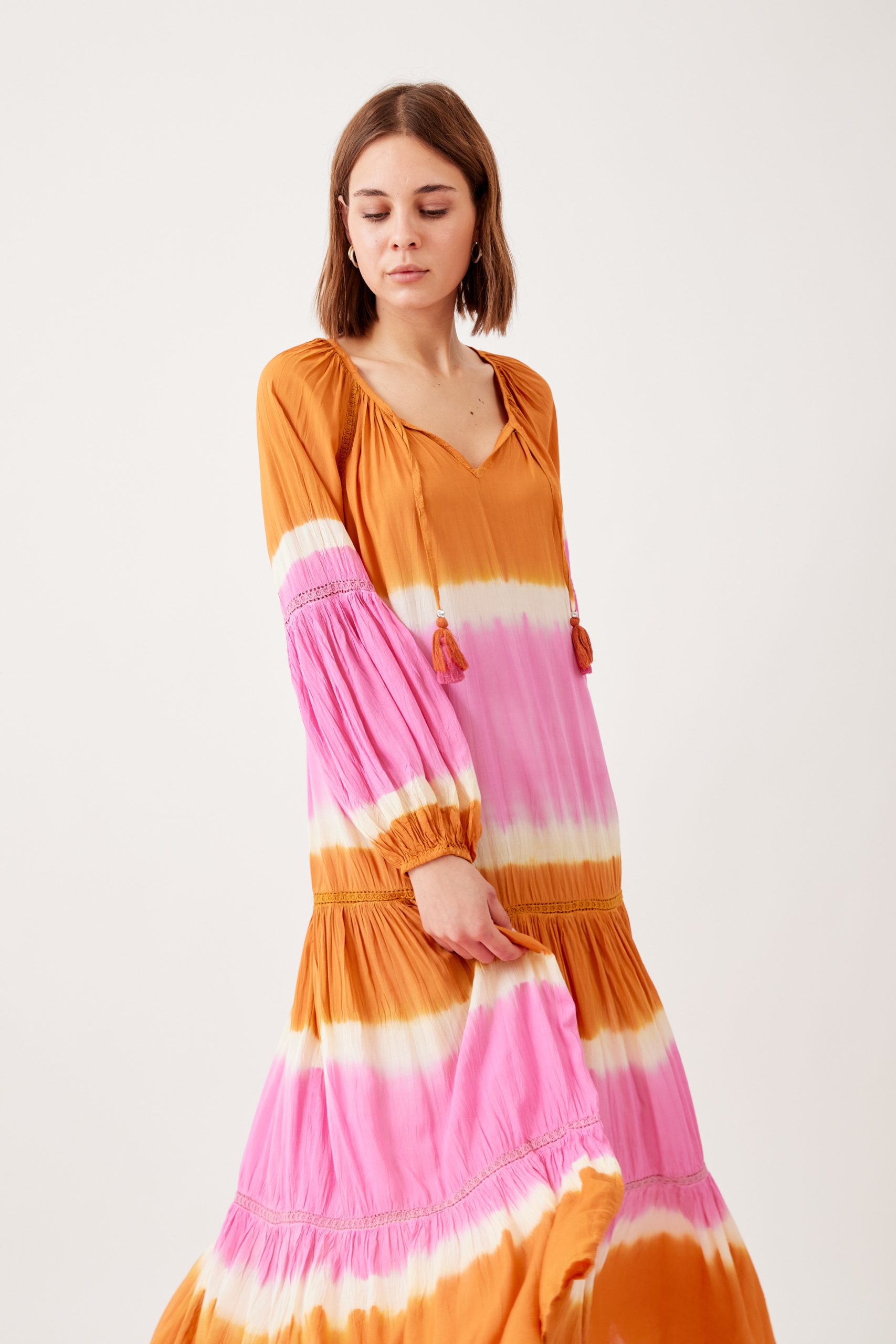 Maya dress is patterned with a mesmerizing a tie- dye motif in a striking colour palette that makes such an impact. Cut from airy viscose , it has softly draped sleeves , a floaty tiered skirt that moves beautifully as you walk and a tie-fastening stand collar. Maya maxi dress makes getting ready for special holiday events feel effortless. Wear yours with strappy sandals and a wide-brimmed hat.