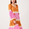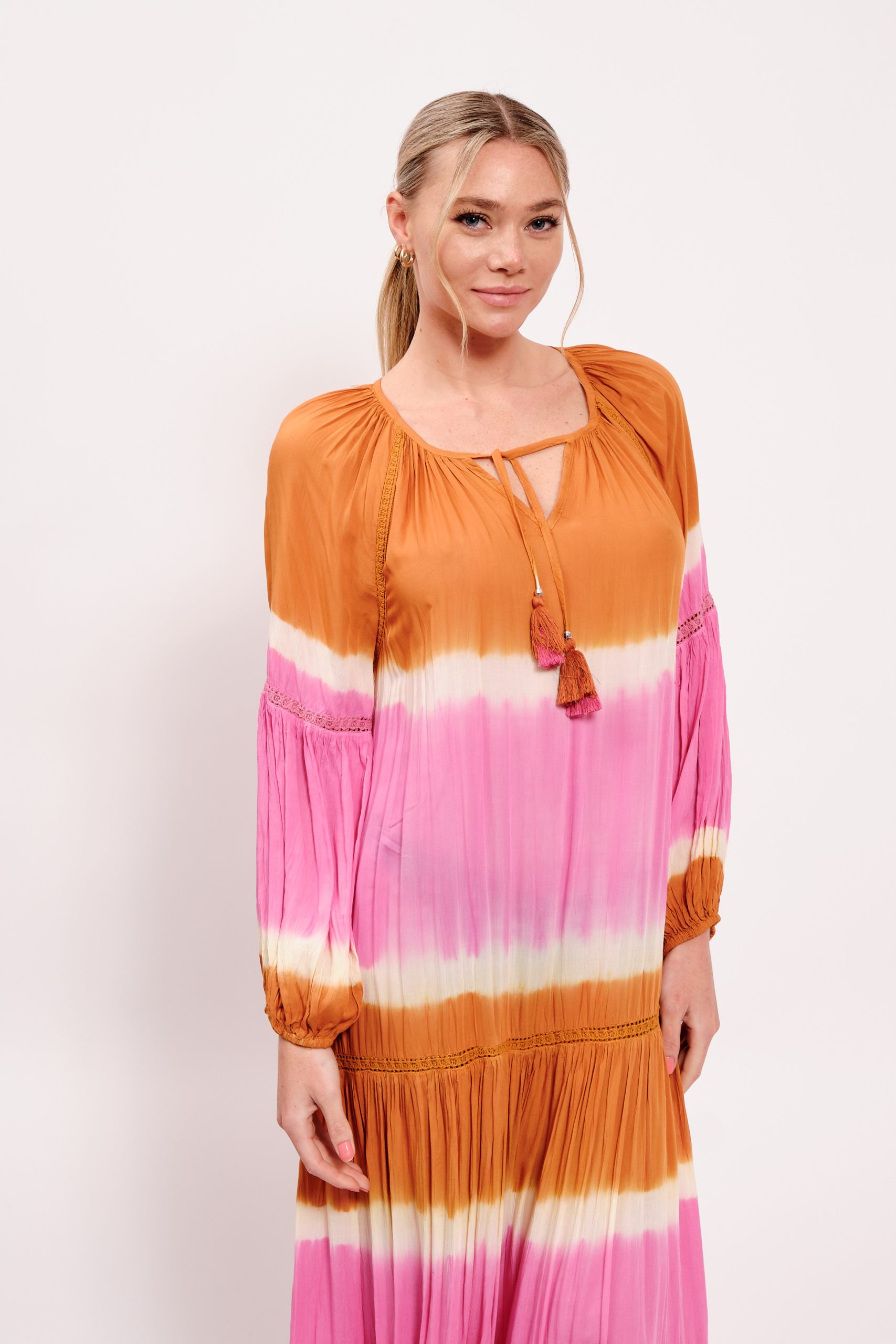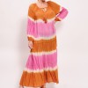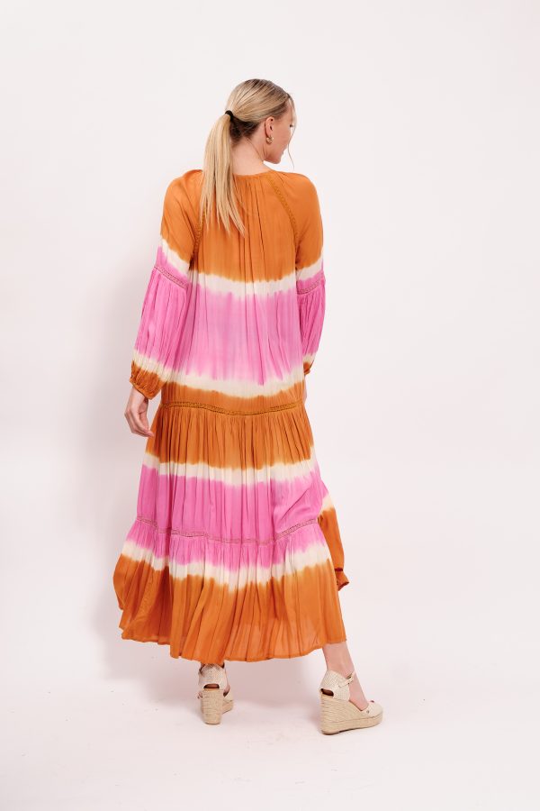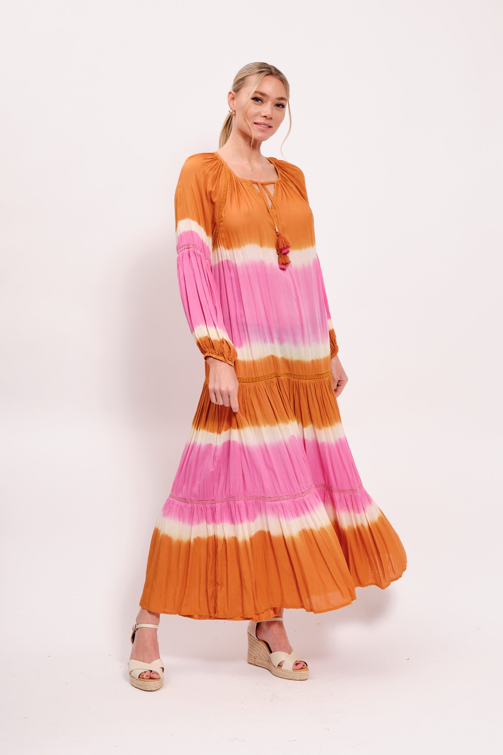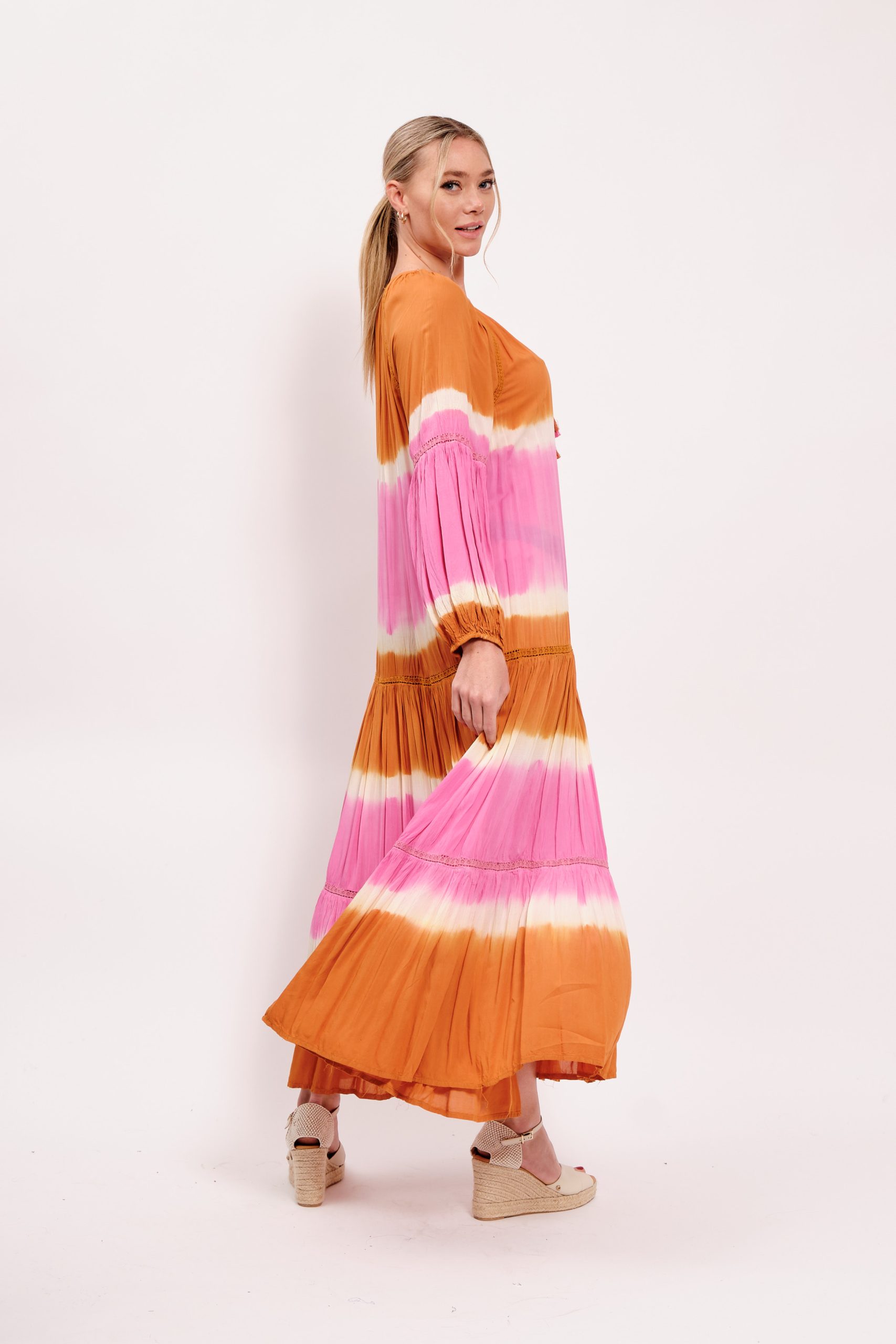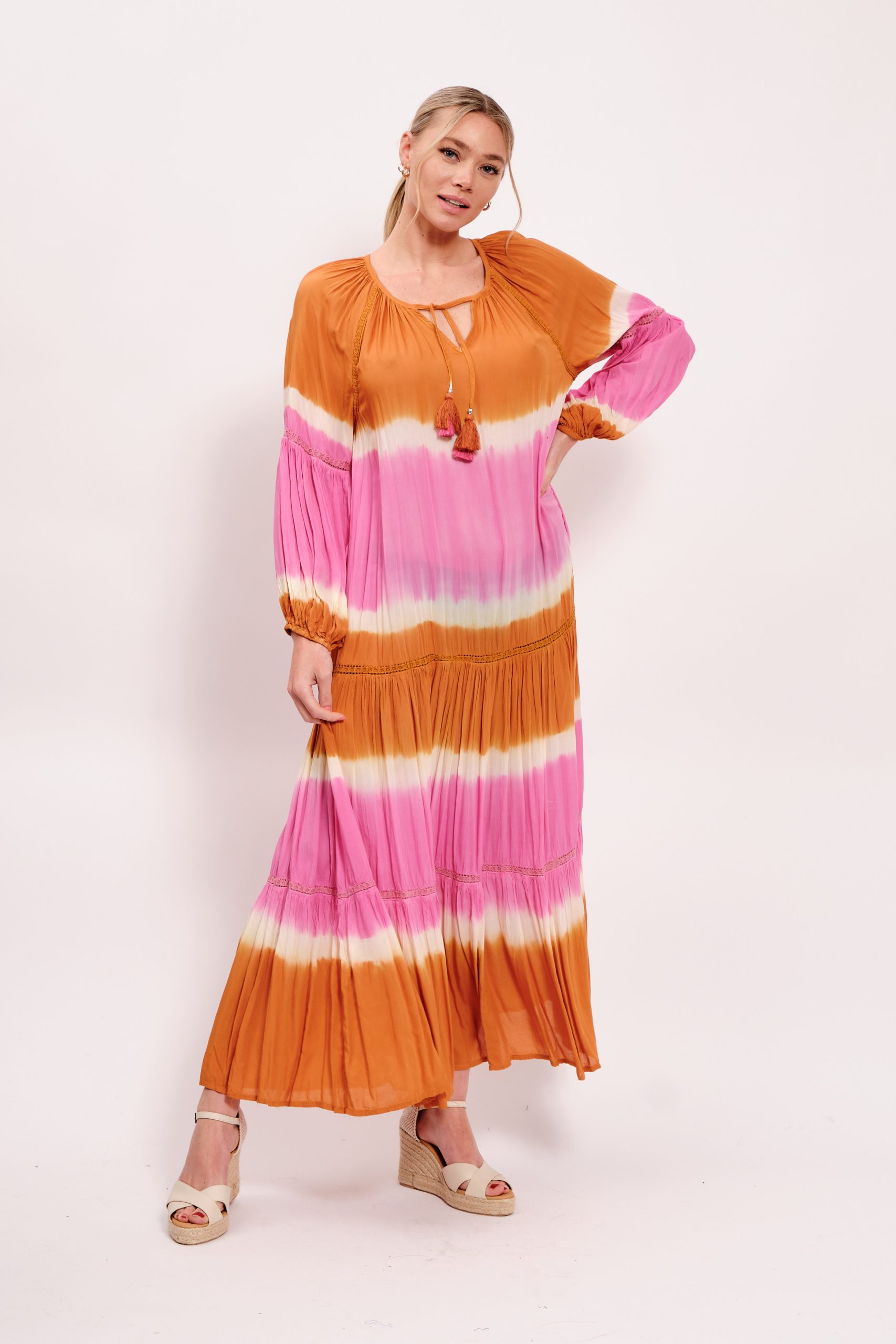 Maya dress is patterned with a mesmerizing a tie- dye motif in a striking colour palette that makes such an impact. Cut from airy viscose , it has softly draped sleeves , a floaty tiered skirt that moves beautifully as you walk and a tie-fastening stand collar. Maya maxi dress makes getting ready for special holiday events feel effortless. Wear yours with strappy sandals and a wide-brimmed hat.