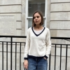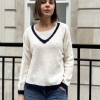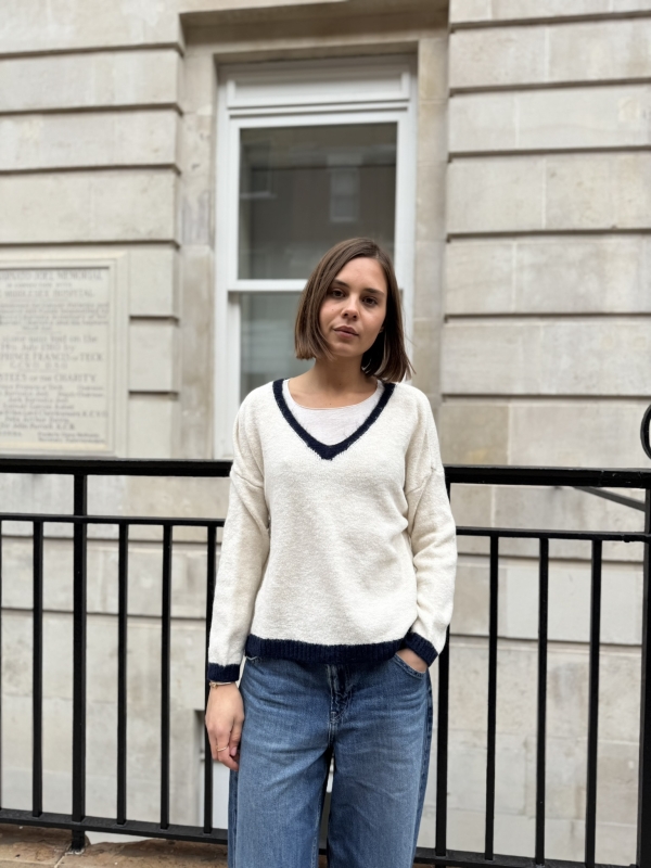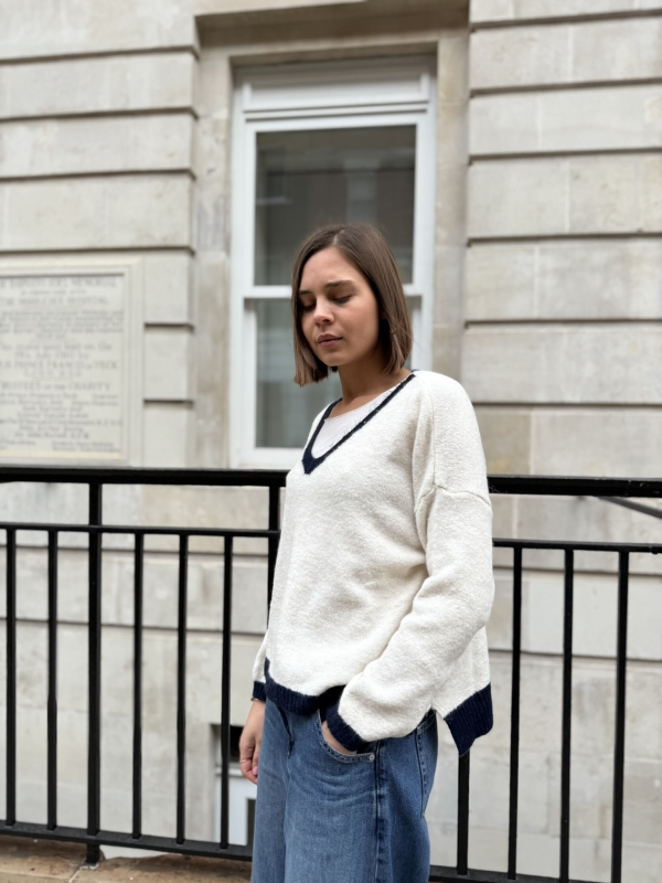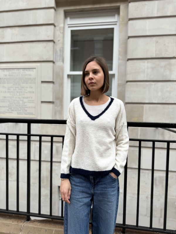 The Mila jumper is a modern wardrobe staple designed with a flattering V-neckline and refined contrast trim detailing. The contrasting edges along the V-neck, cuffs, and hem add a subtle yet stylish accent, giving this classic knit a fresh and polished finish.