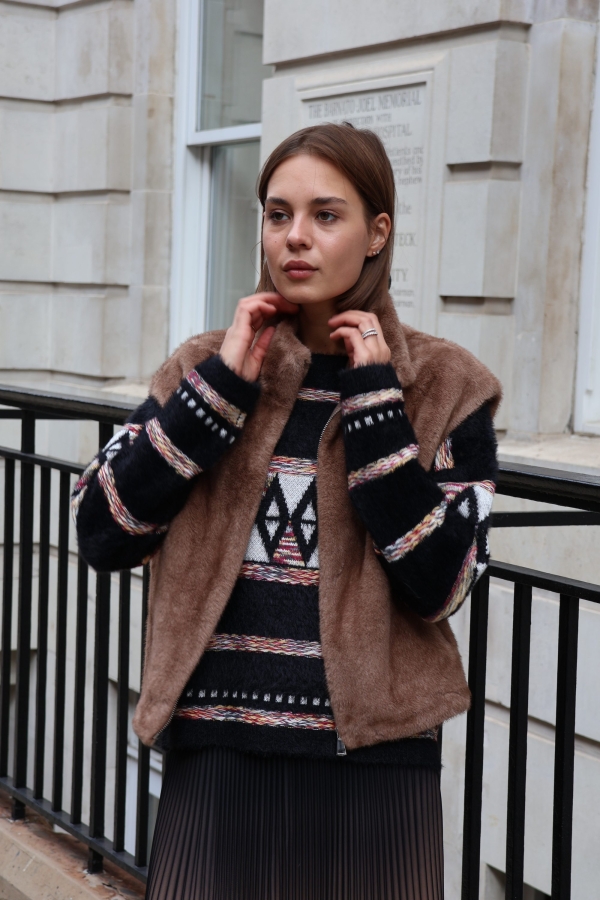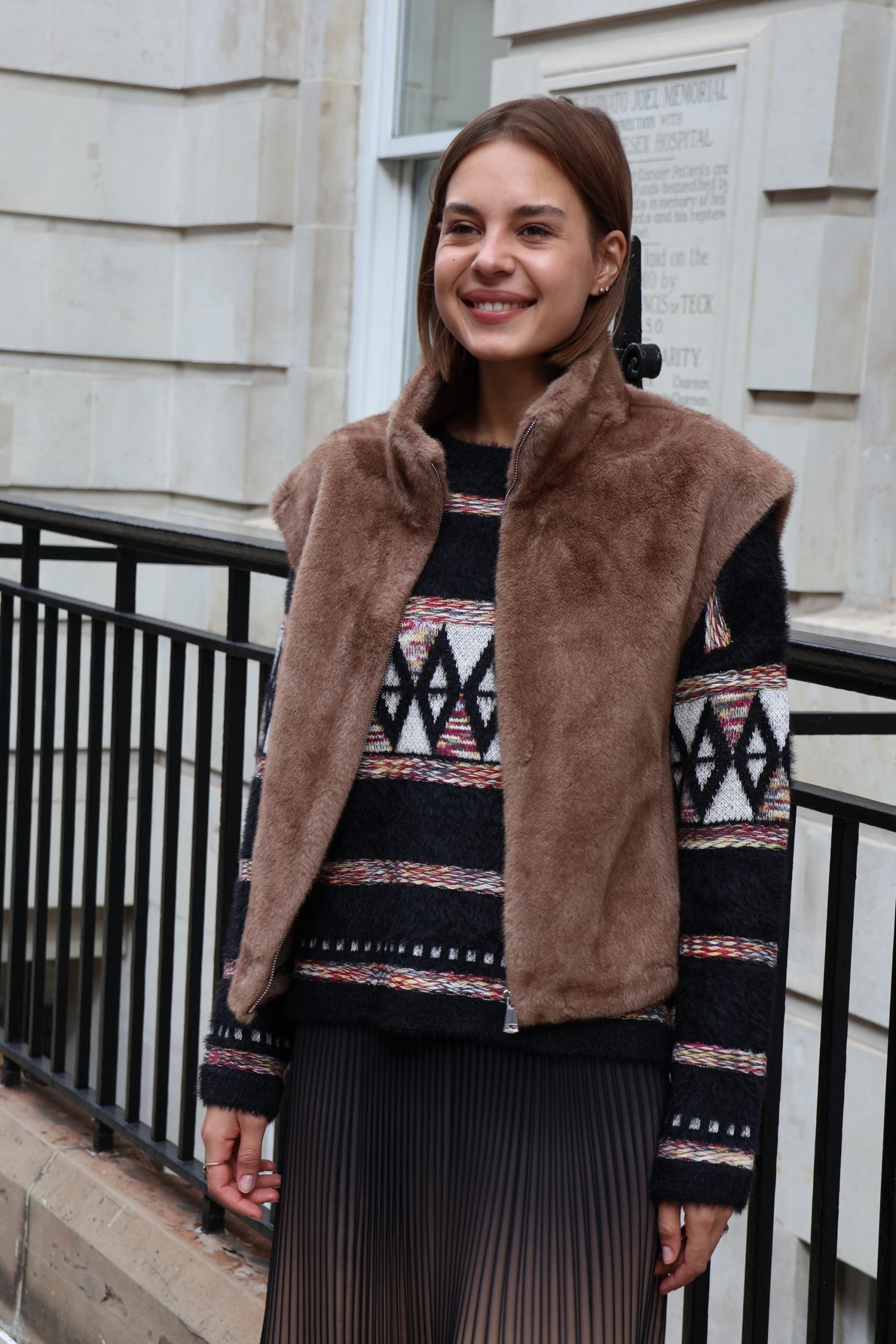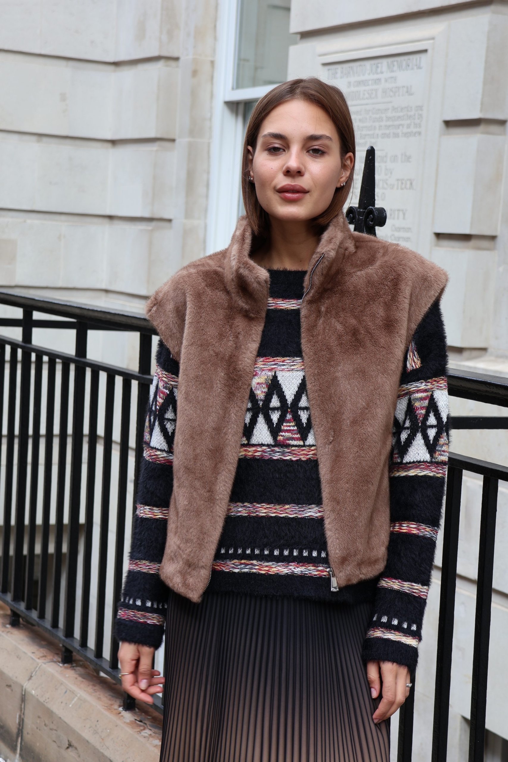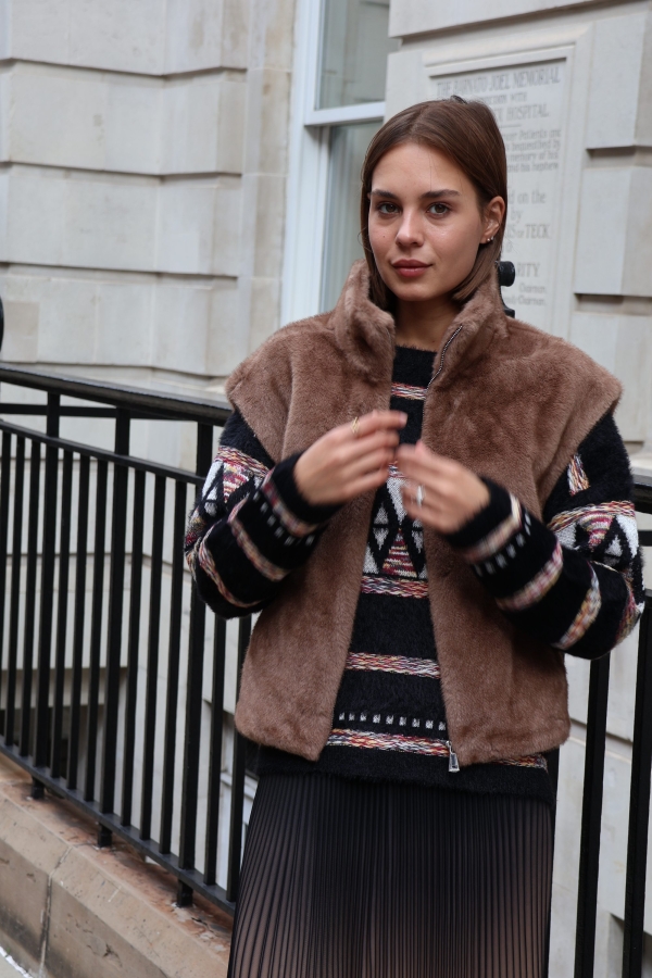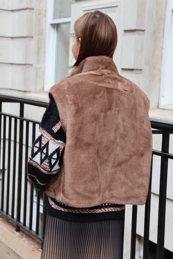 Mila outerwear feels so soft and luxurious, you’re guaranteed to be reaching for it on rotation all season long. This  style has been made from plush faux fur . The minimal design is enhanced by a collarless neckline , while the smooth satin lining ensures easy layering. Mila gilet offers the look of chic luxury while offering plenty of warmth.  This jacket is cut for a subtly cropped profile from fluffy faux fur. Lean into the relaxed mood by styling yours with just  about anything.