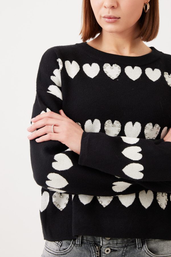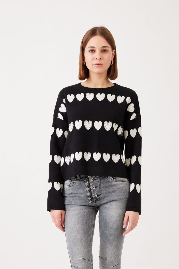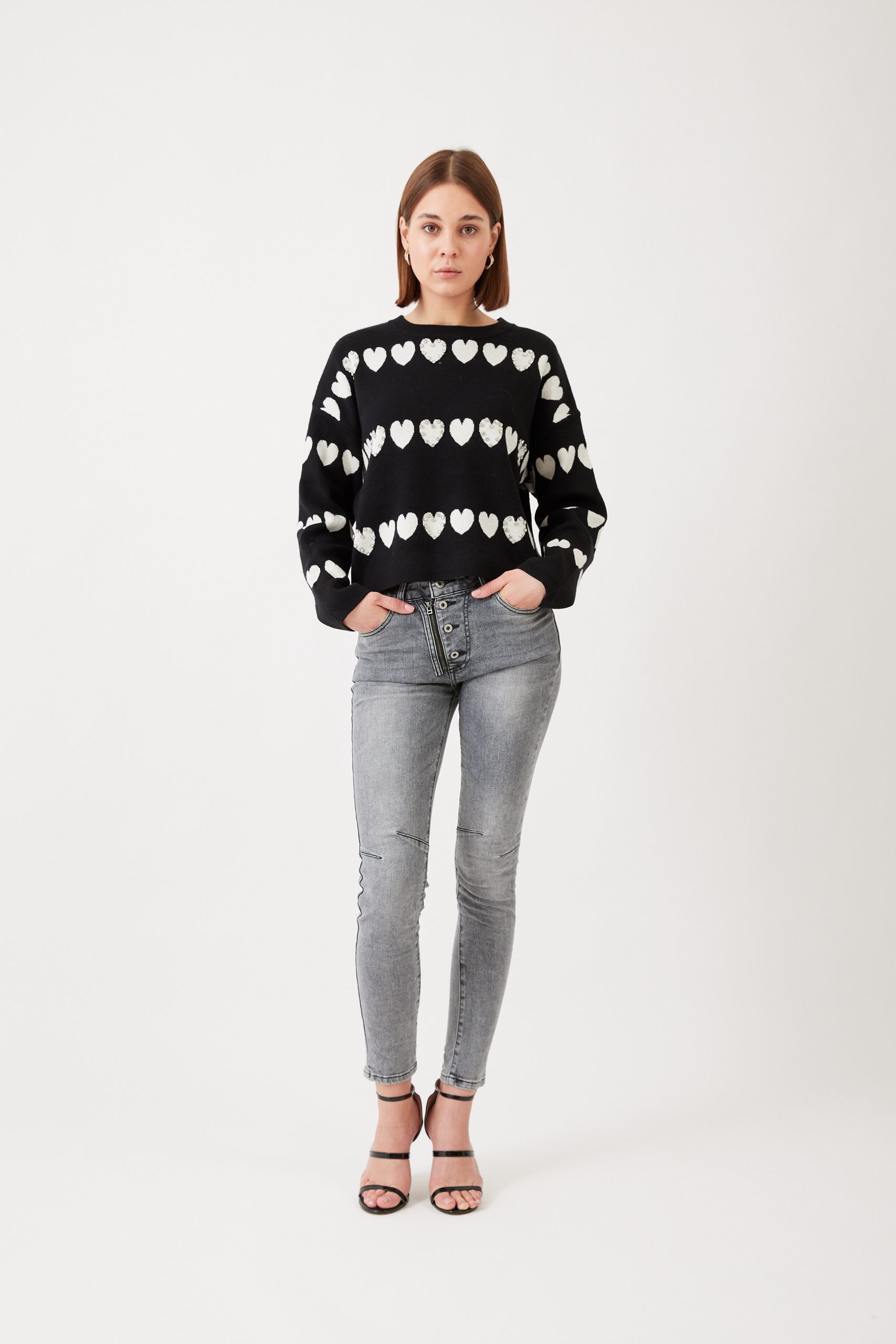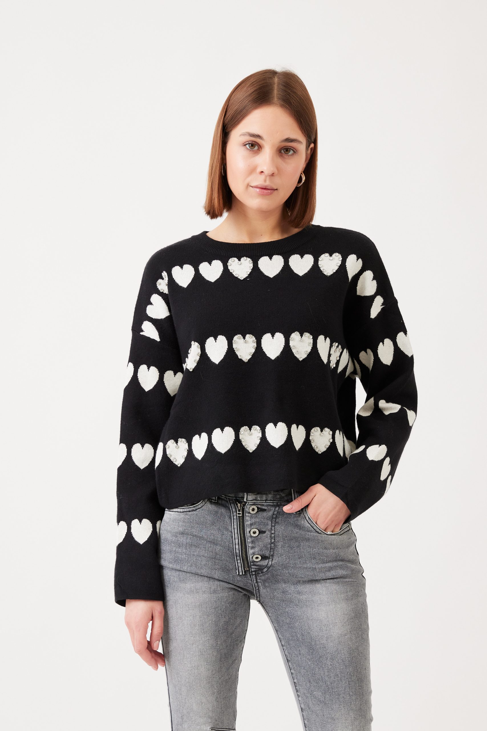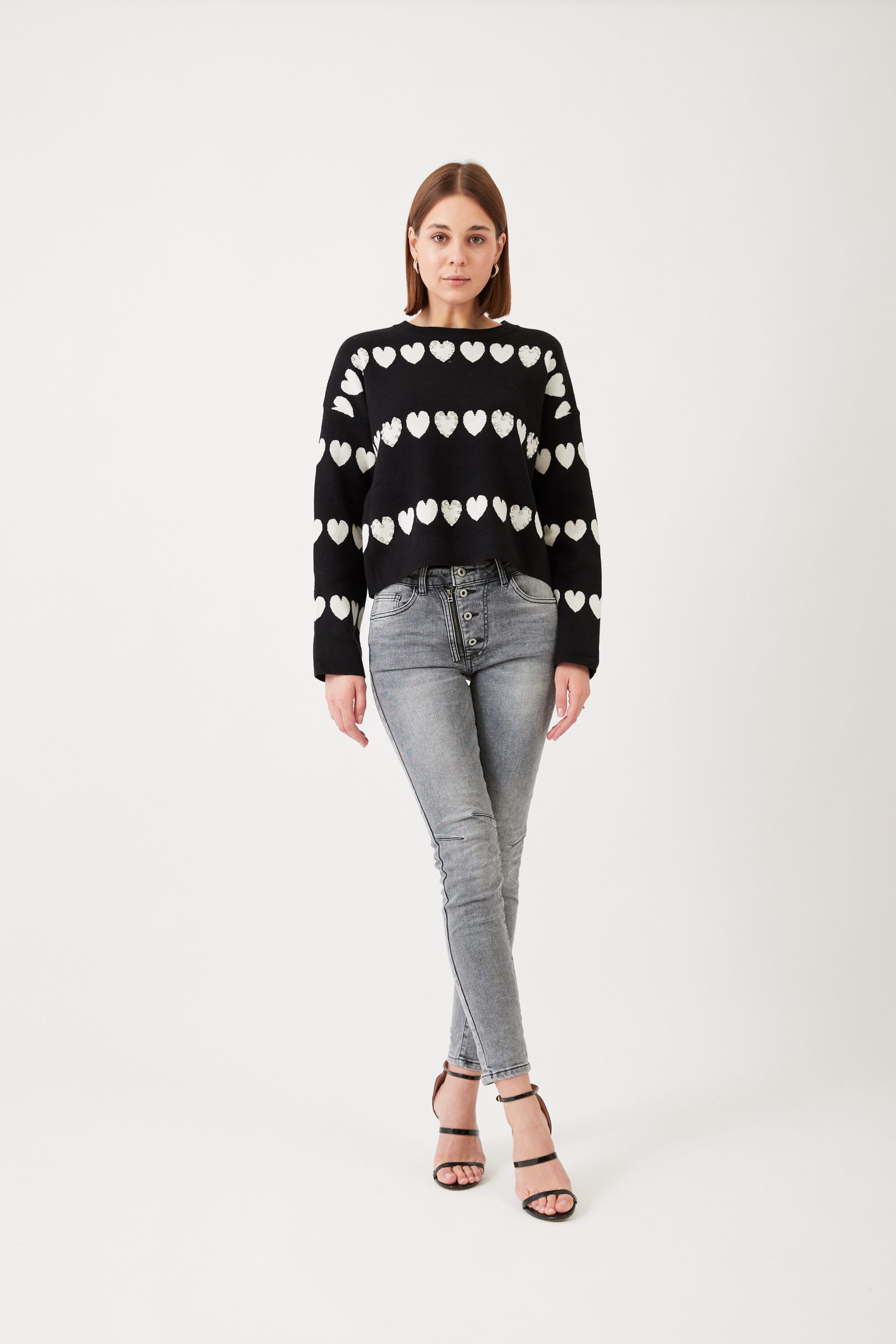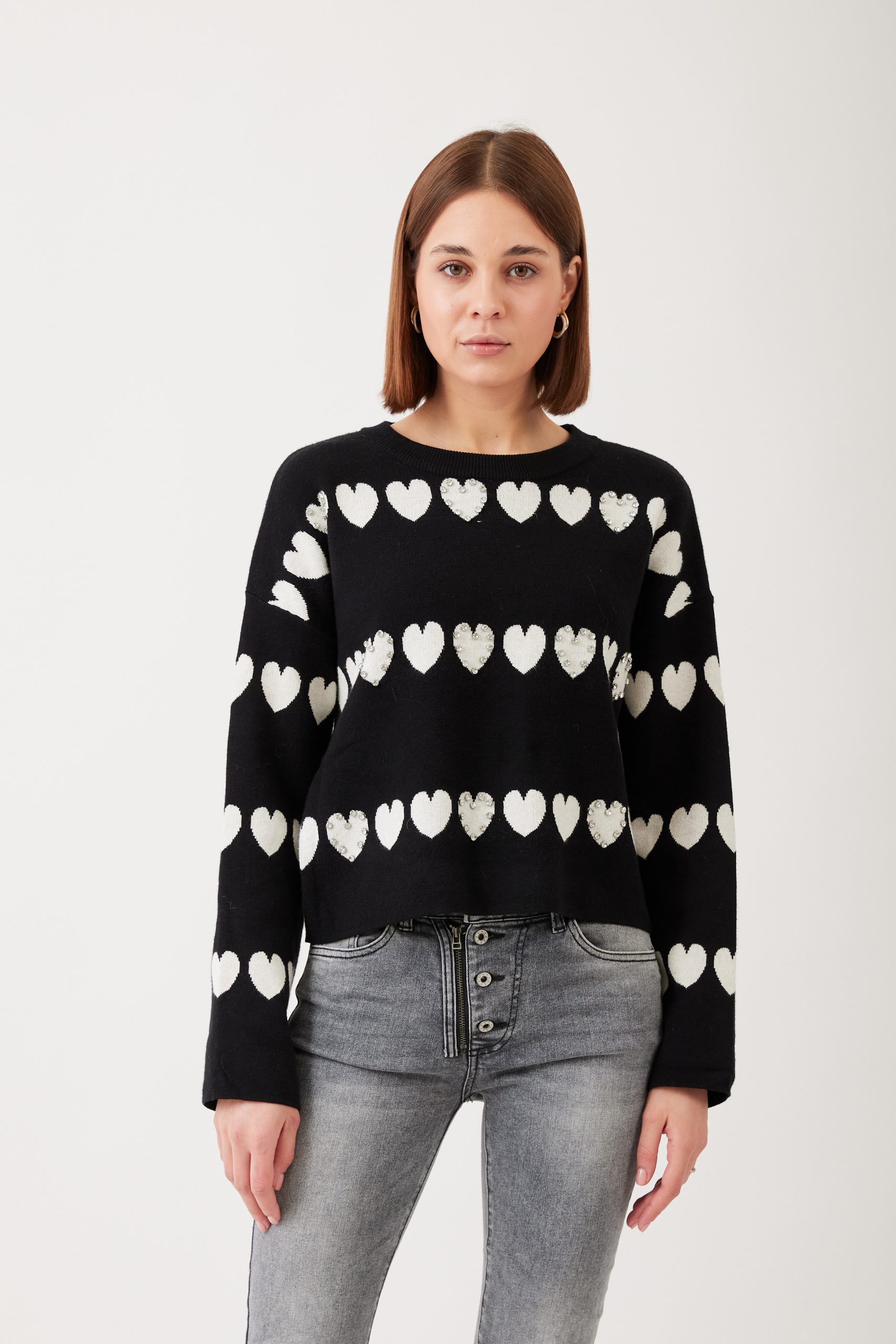 Millie sweater is knitted from exceptionally soft recycled polyester and wool , warm and soft . Designed with embellished sequins hearts, it has dropped shoulders and a slightly longer back hem that emphasises the relaxed shape. It’s designed for a relaxed fit and defined by thick ribbed trims – the type of detail that sets your wardrobe staples apart. This  v neck sweater drapes beautifully and has ribbed trims that are perfect for tucking into the waistband of your skirt or jeans.