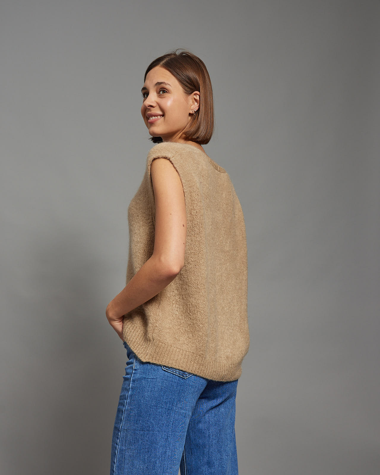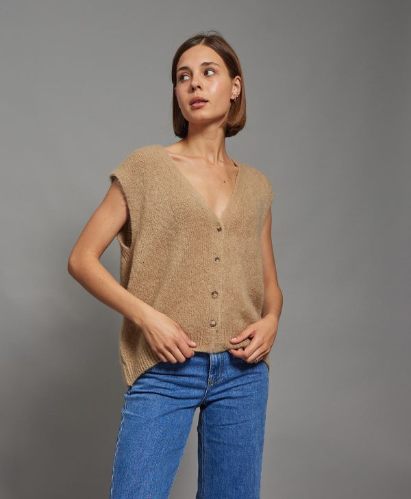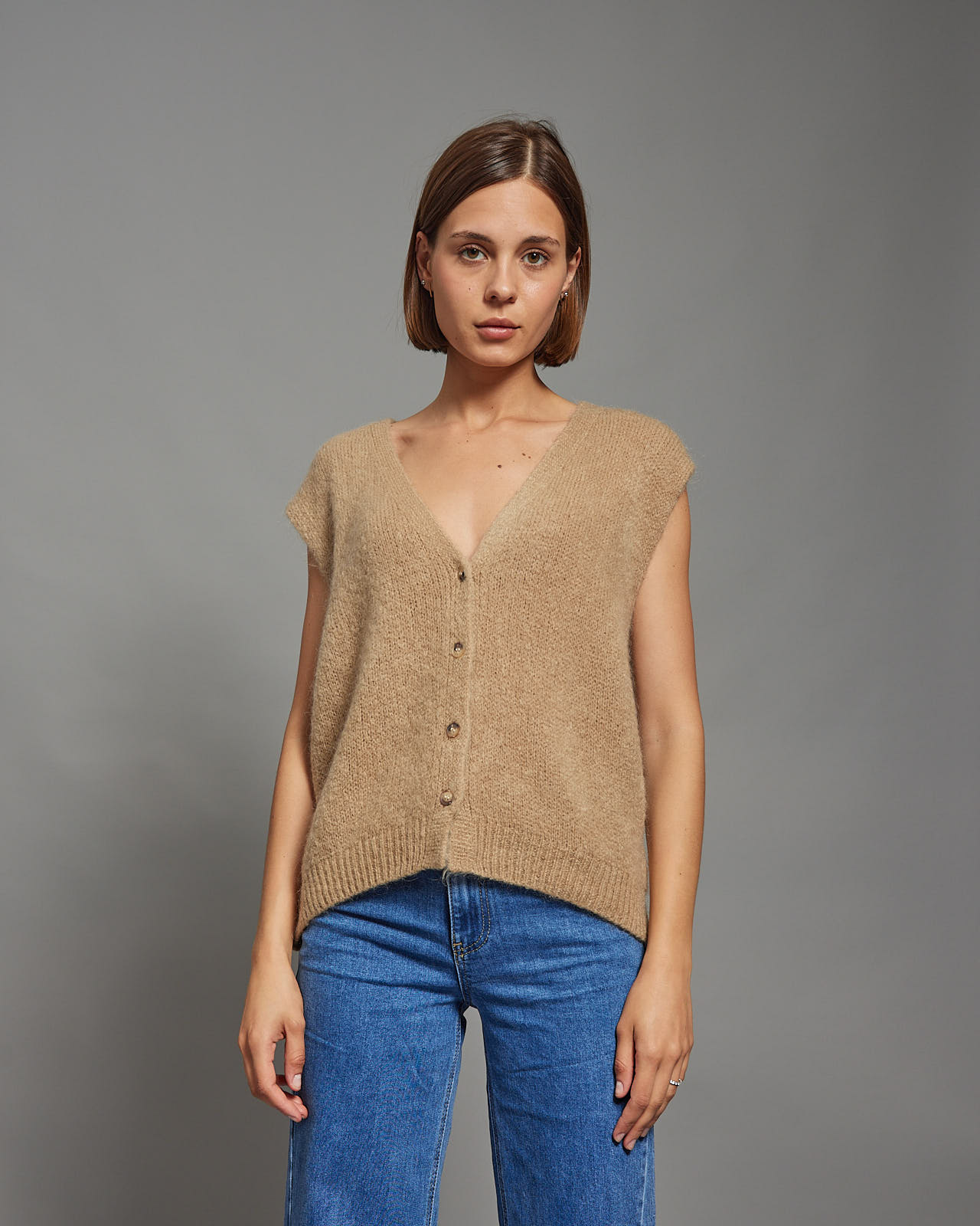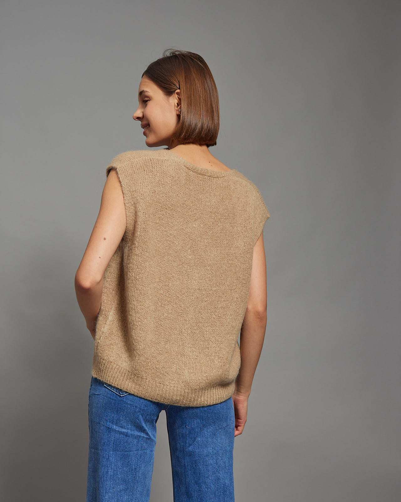 Knitted vest Nicole  is made from cosy wool and kid mohair blend. It’s traced with ribbed trims and looks just as chic over crisp shirting as it does solo. Wear yours on its own or layered over a collared shirt. Style yours with a sleek midi skirt or tailored pants.