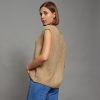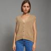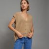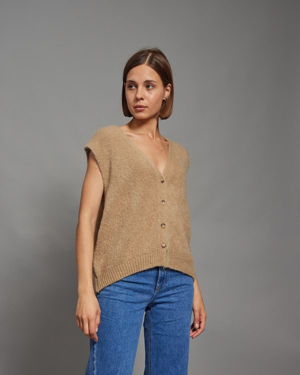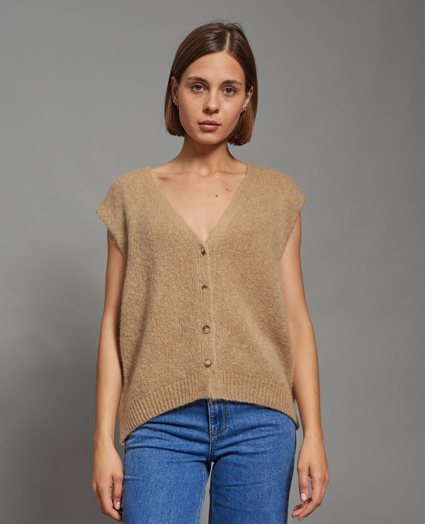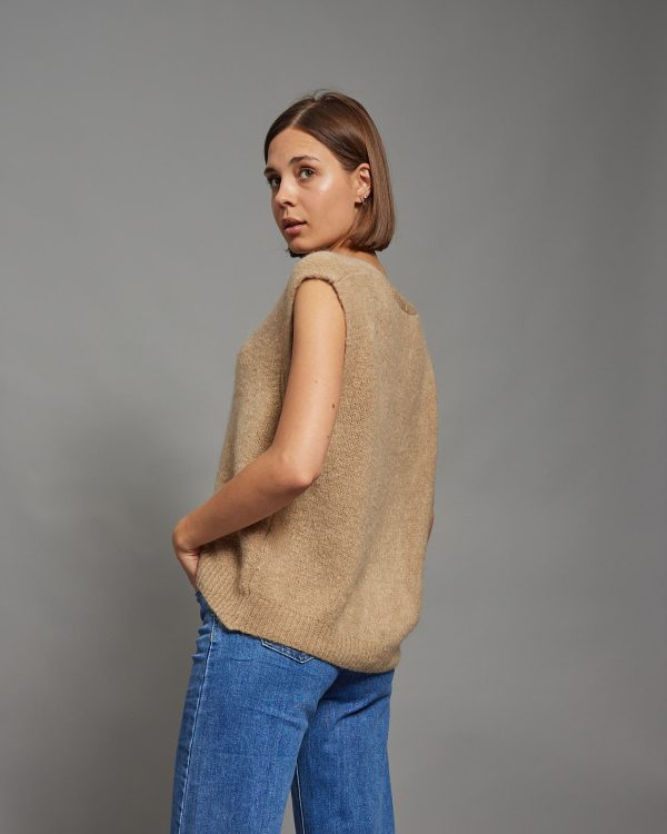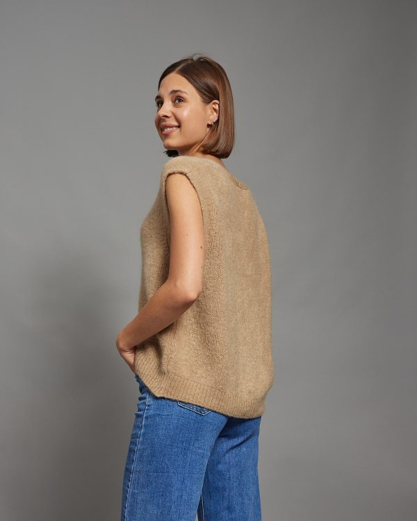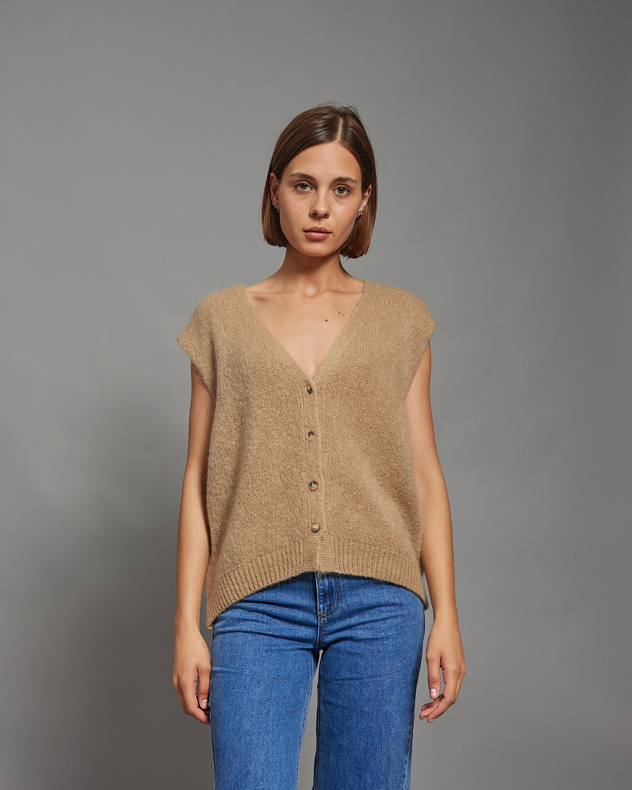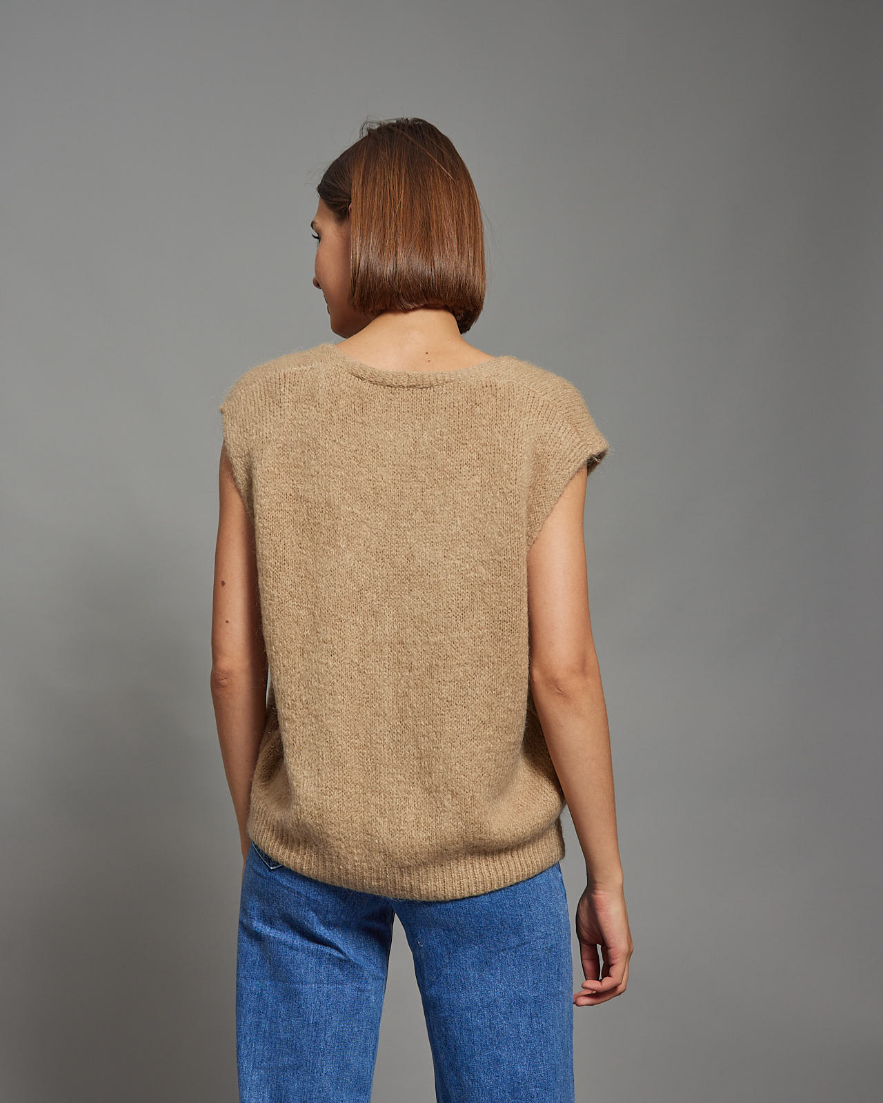 Knitted vest Nicole  is made from cosy wool and kid mohair blend. It’s traced with ribbed trims and looks just as chic over crisp shirting as it does solo. Wear yours on its own or layered over a collared shirt. Style yours with a sleek midi skirt or tailored pants.