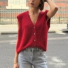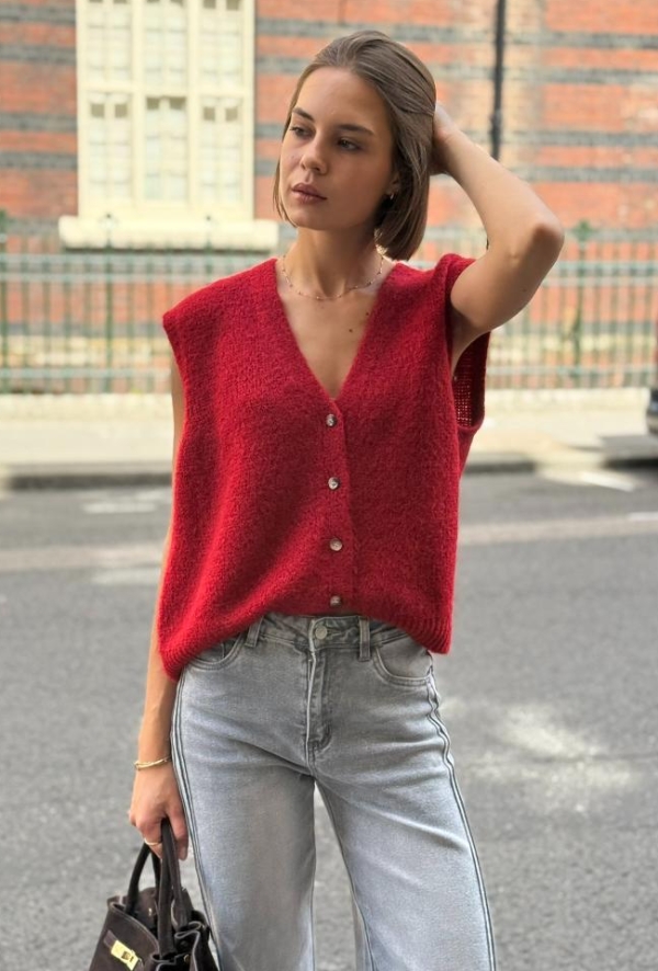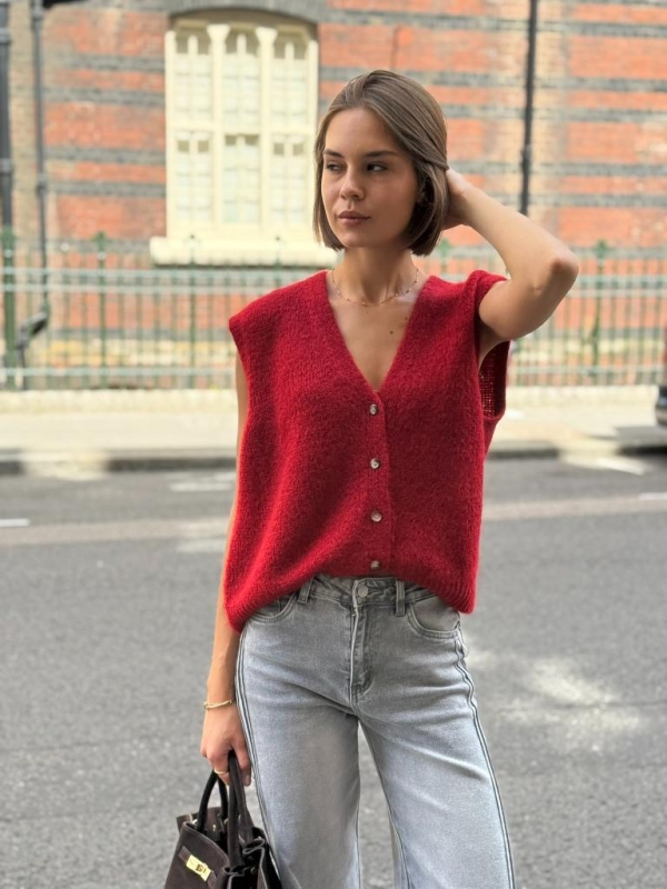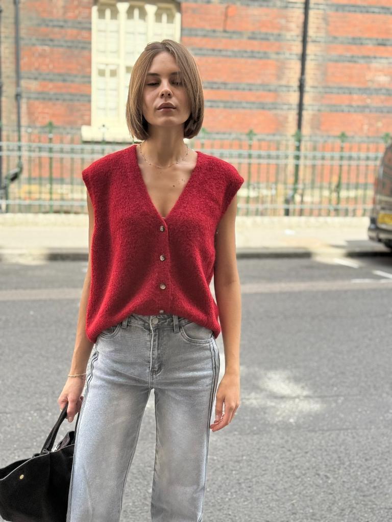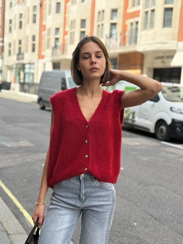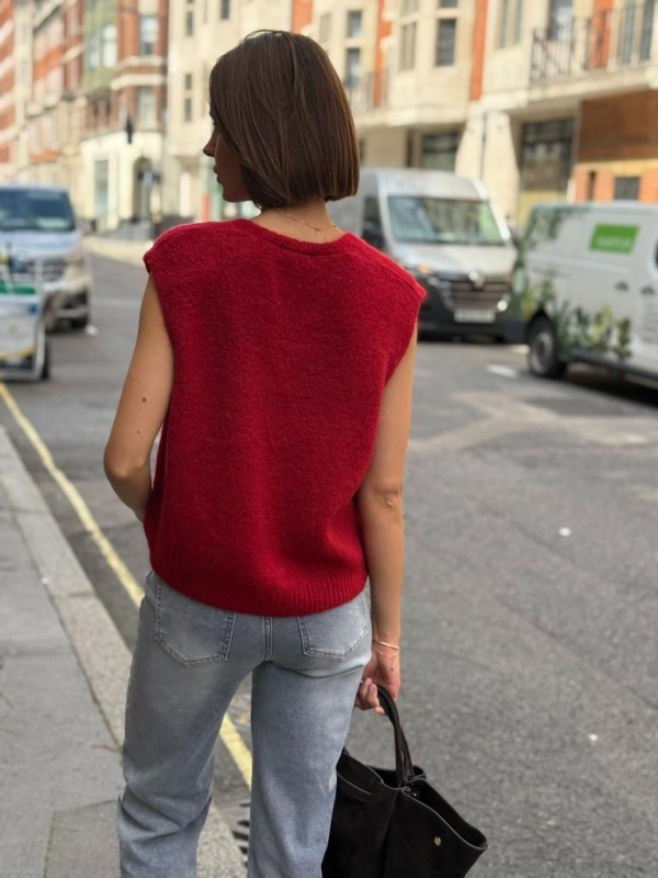 Knitted vest Nicole  is made from cosy wool and kid mohair blend. It’s traced with ribbed trims and looks just as chic over crisp shirting as it does solo. Wear yours on its own or layered over a collared shirt. Style yours with a sleek midi skirt or tailored pants.