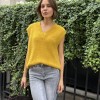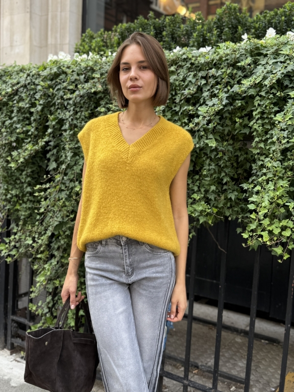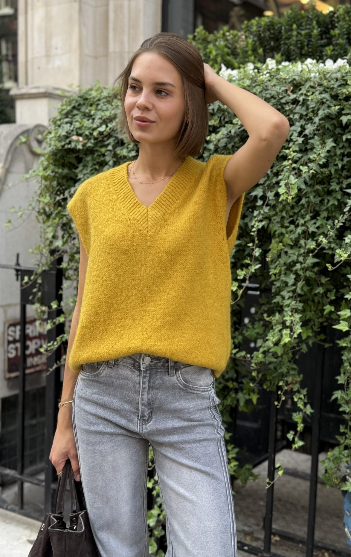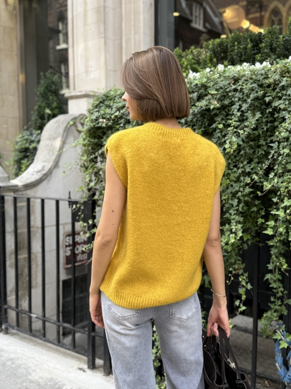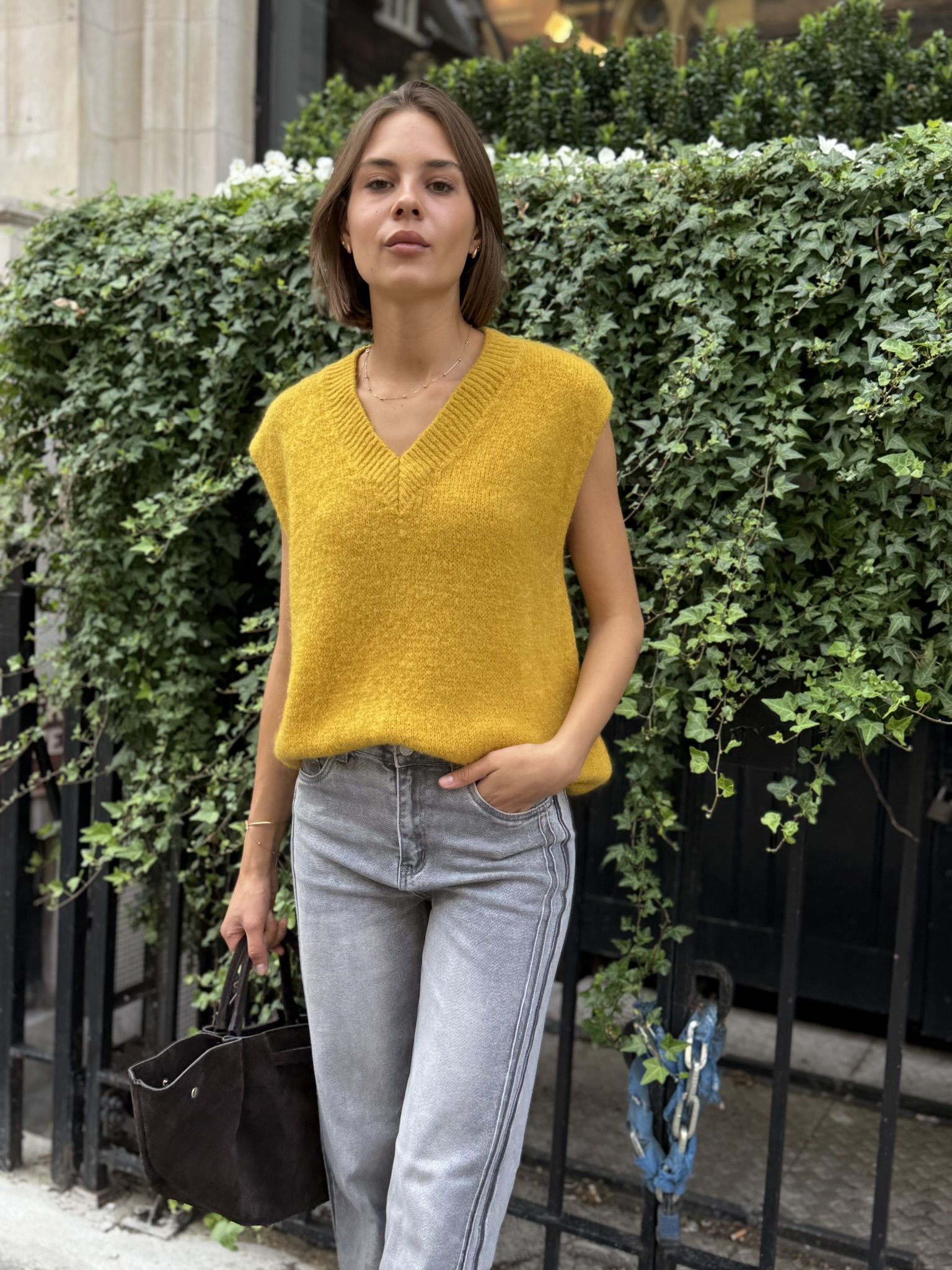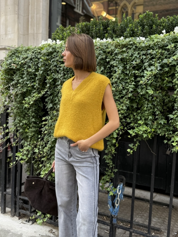 Knitted vest Nina is made from cosy wool, viscose and mohair blend. It’s traced with ribbed trims and looks just as chic over crisp shirting as it does solo. Wear yours on its own or layered over a collared shirt. Style yours with a sleek midi skirt or tailored pants.