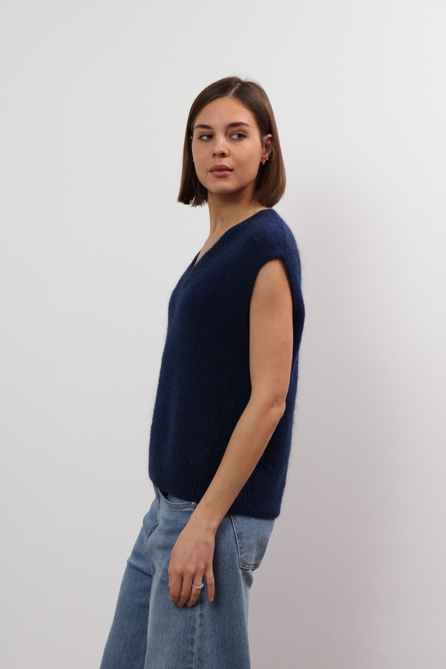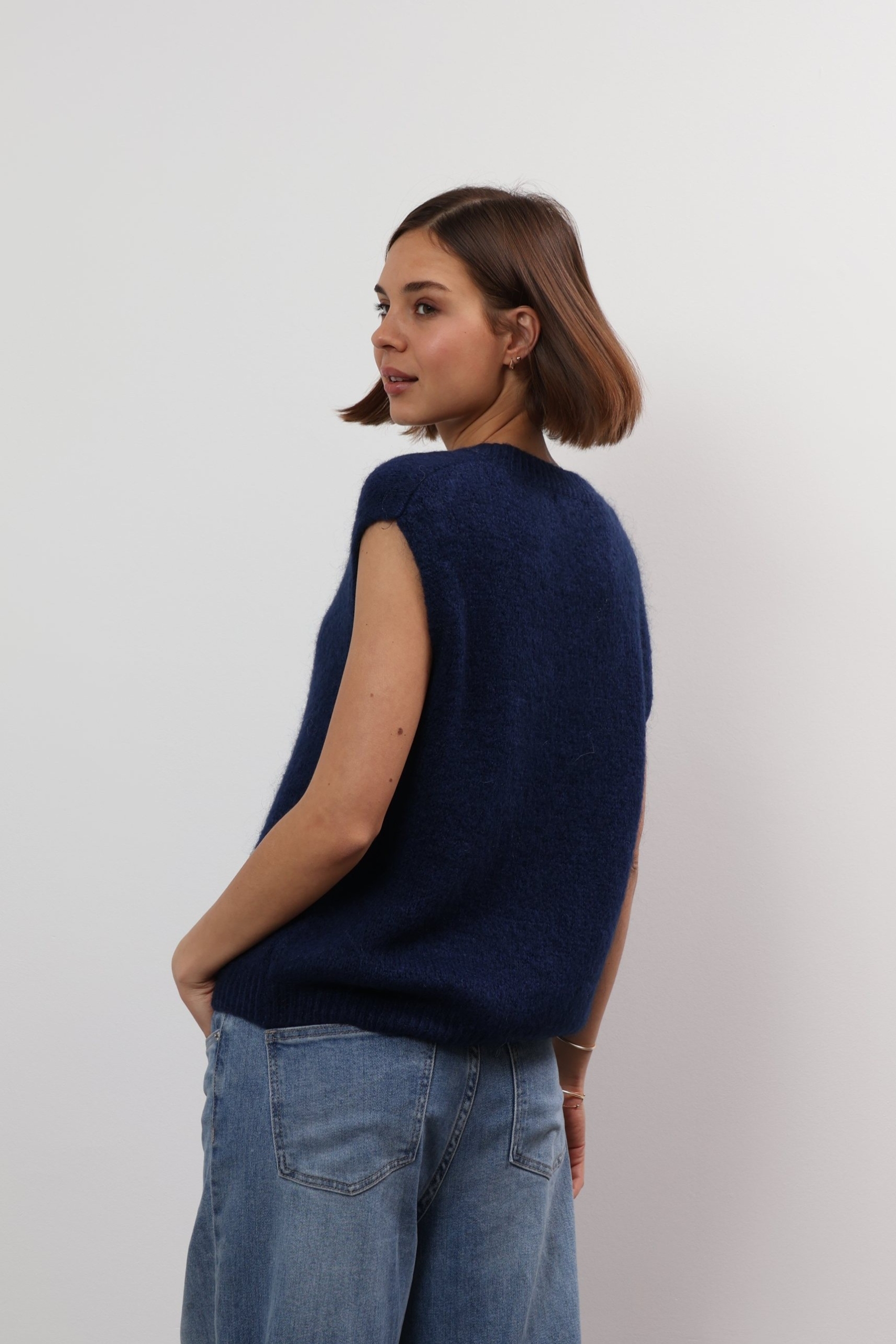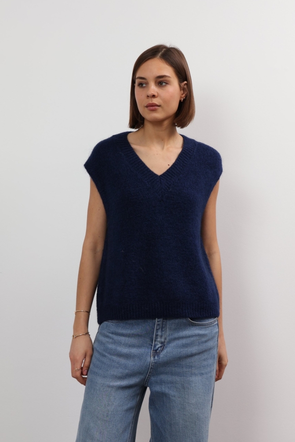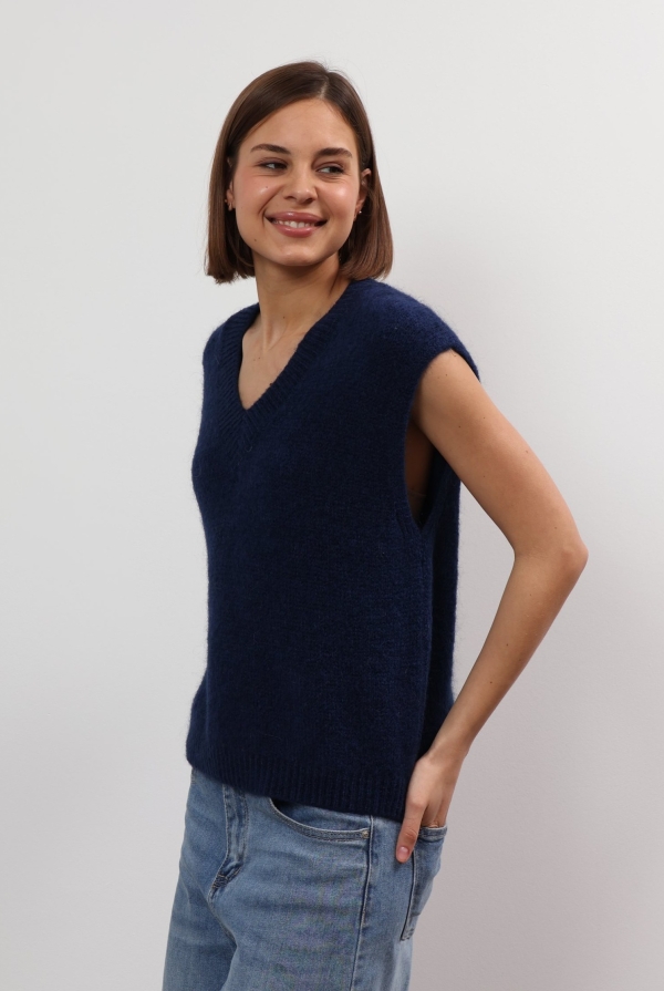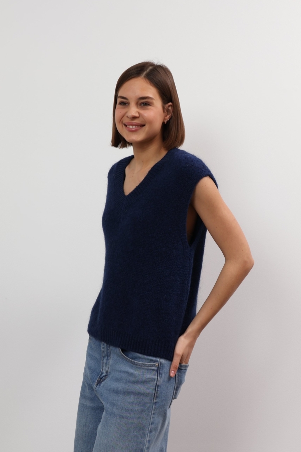 Knitted vest Nina is made from cosy wool, viscose and mohair blend. It’s traced with ribbed trims and looks just as chic over crisp shirting as it does solo. Wear yours on its own or layered over a collared shirt. Style yours with a sleek midi skirt or tailored pants.