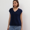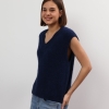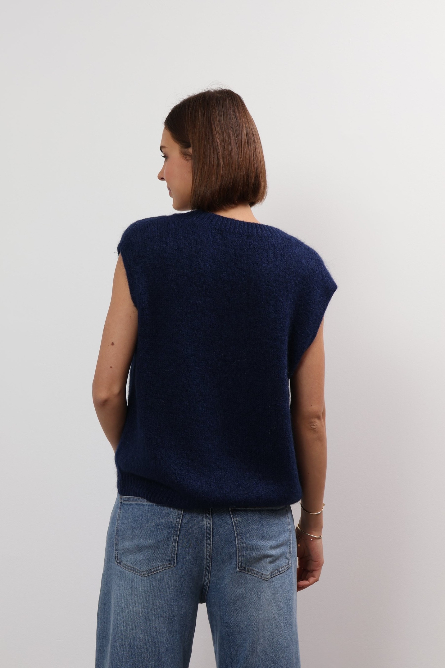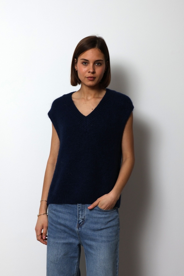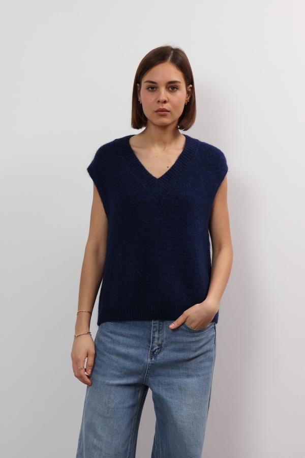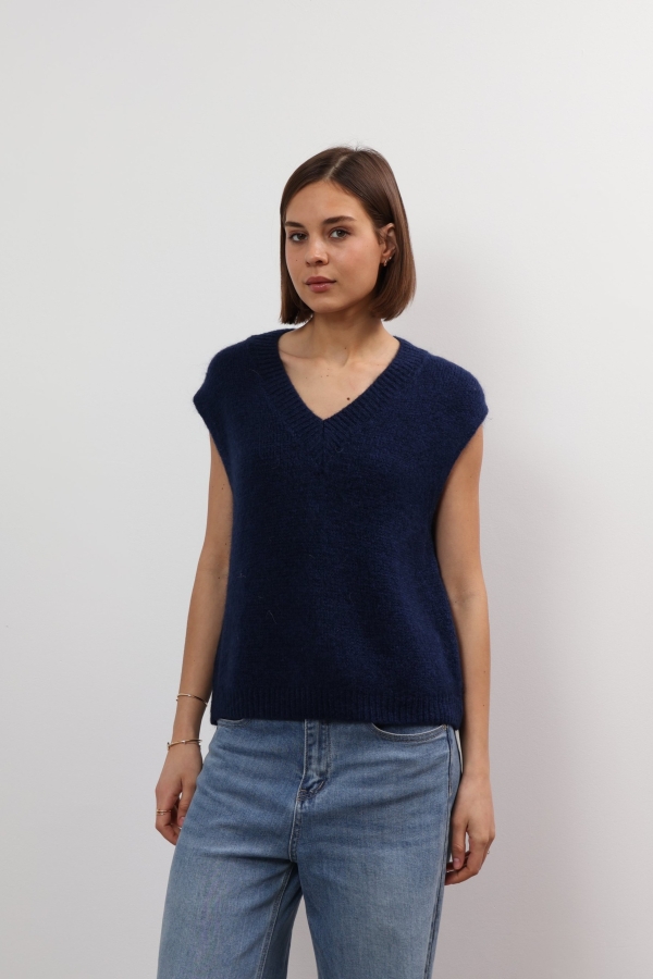 Knitted vest Nina is made from cosy wool, viscose and mohair blend. It’s traced with ribbed trims and looks just as chic over crisp shirting as it does solo. Wear yours on its own or layered over a collared shirt. Style yours with a sleek midi skirt or tailored pants.