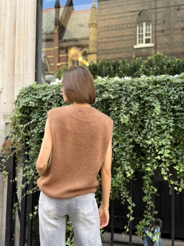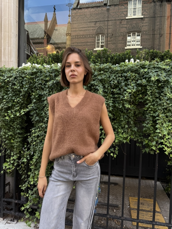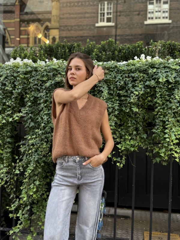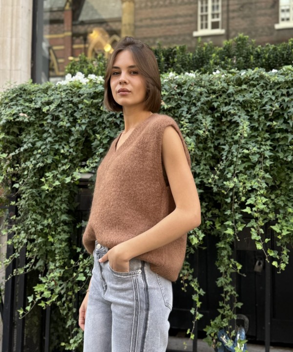 Knitted vest Nina is made from cosy wool, viscose and mohair blend. It’s traced with ribbed trims and looks just as chic over crisp shirting as it does solo. Wear yours on its own or layered over a collared shirt. Style yours with a sleek midi skirt or tailored pants.