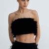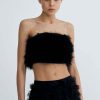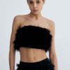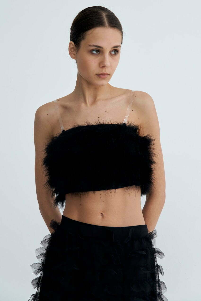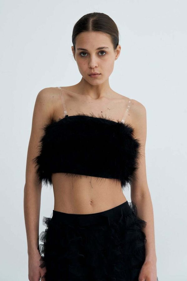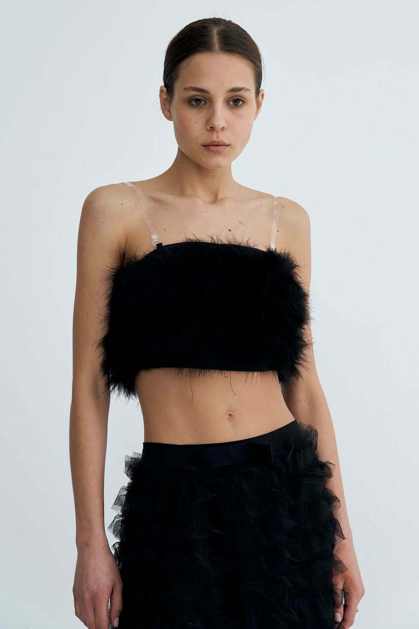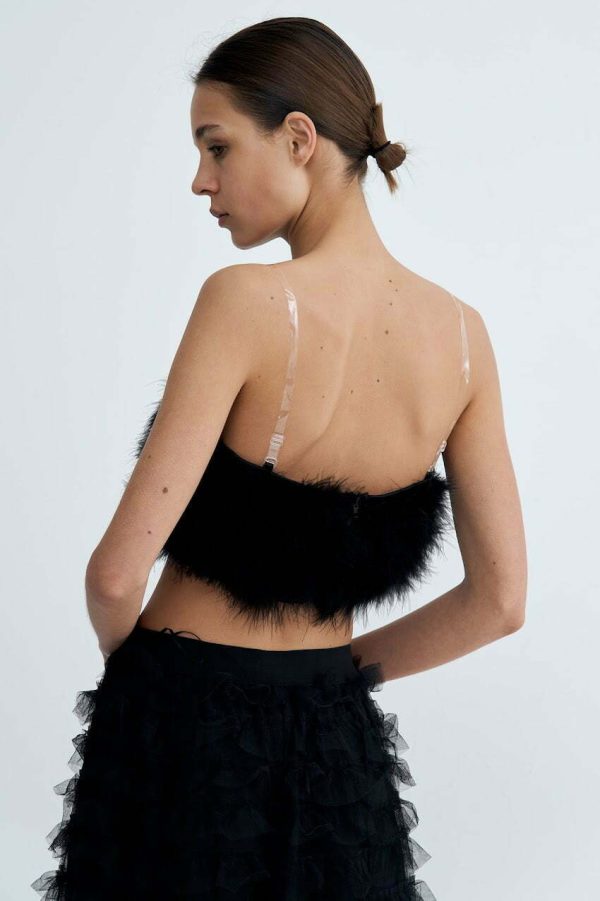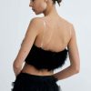 Fiora camisole is embellished with rows of black feathers that move softly with every step. It has a close-fitting, cropped silhouette and adjustable shoulder straps. Style it with high-rise jeans or tailoring.