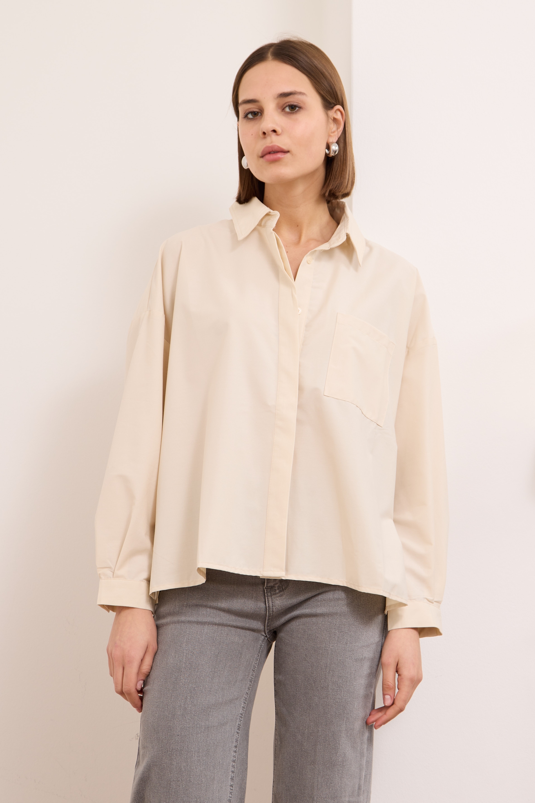 This shirt will go so far in your wardrobe – style yours half-tucked into jeans, silk pants cinched with a belt or layered under a knit vest. It has a relaxed shape with pleated back and buttoned cuffs and a long, curved hem.  It’s cut from cotton-blend and has a chest pocket. Wear it with a striped sweater wrapped around your shoulders. Leave a few buttons undone at the collared neckline and hem for a casual feel.