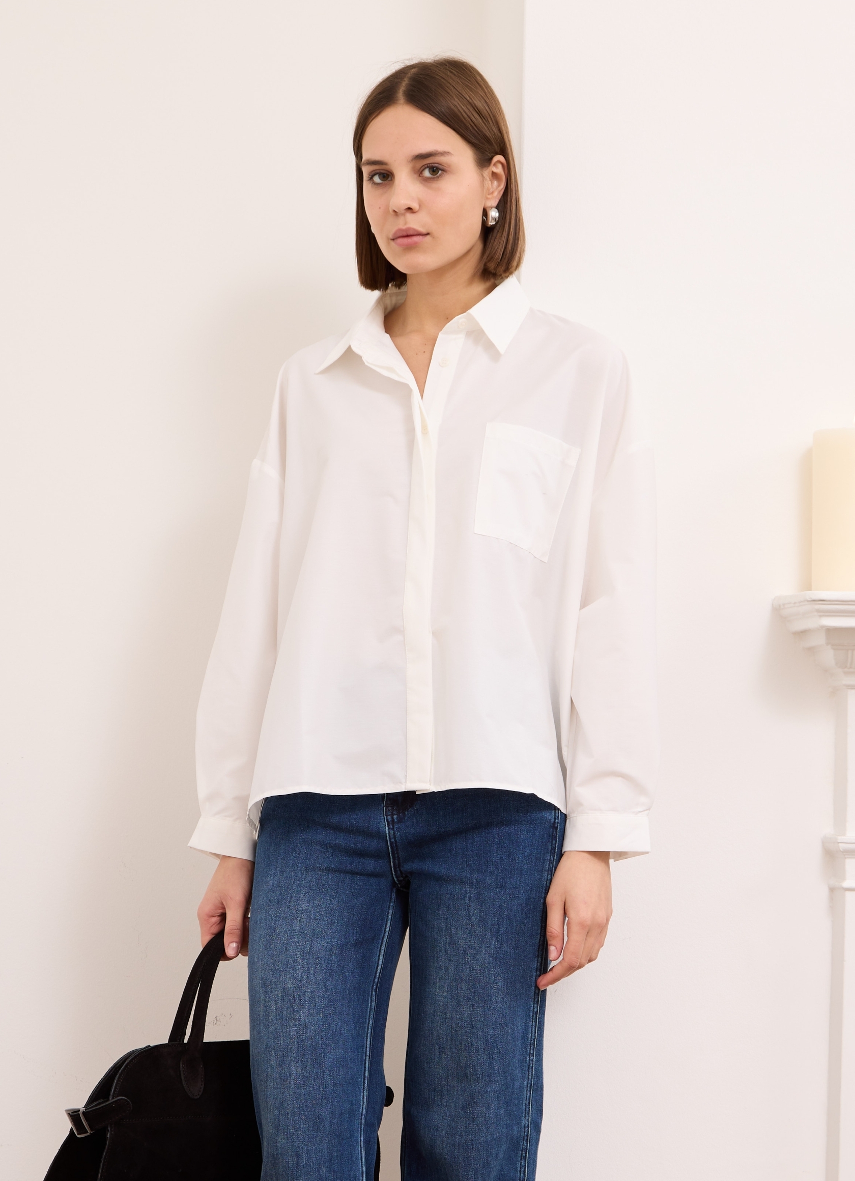 This shirt will go so far in your wardrobe – style yours half-tucked into jeans, silk pants cinched with a belt or layered under a knit vest. It has a relaxed shape with pleated back and buttoned cuffs and a long, curved hem.  It’s cut from cotton-blend and has a chest pocket. Wear it with a striped sweater wrapped around your shoulders. Leave a few buttons undone at the collared neckline and hem for a casual feel.