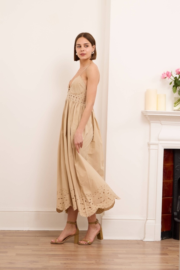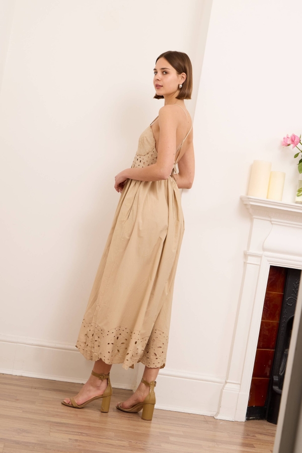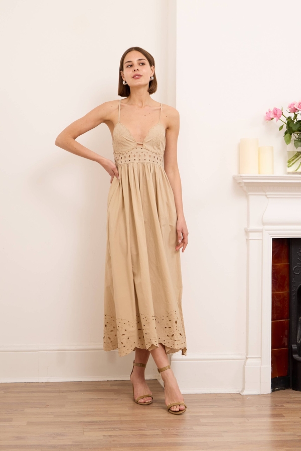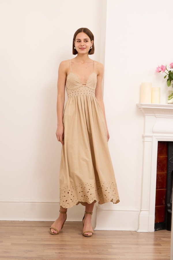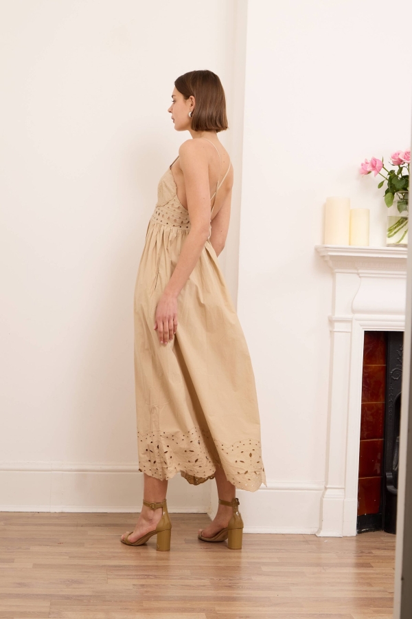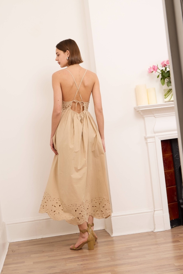 The best thing about a beautiful strappy summer dress is that you’ll never fall out of love with it. All about the broderie anglaise , Shay dress is cut from lightweight cotton , so it falls and gleams effortlessly. The plunging bodice is framed by delicate straps that expose the open back. Style yours with a red lip and sandals.