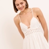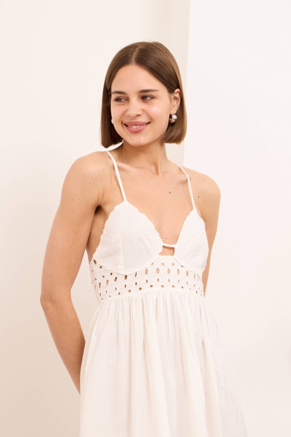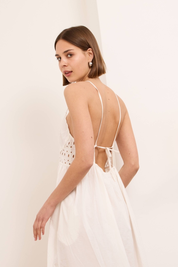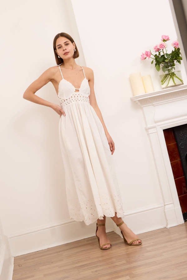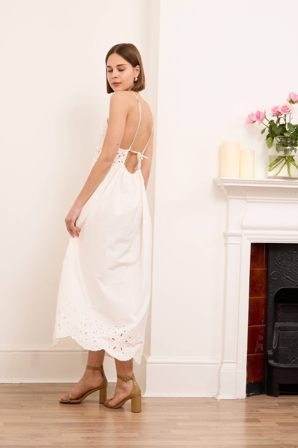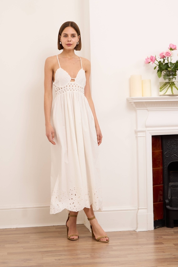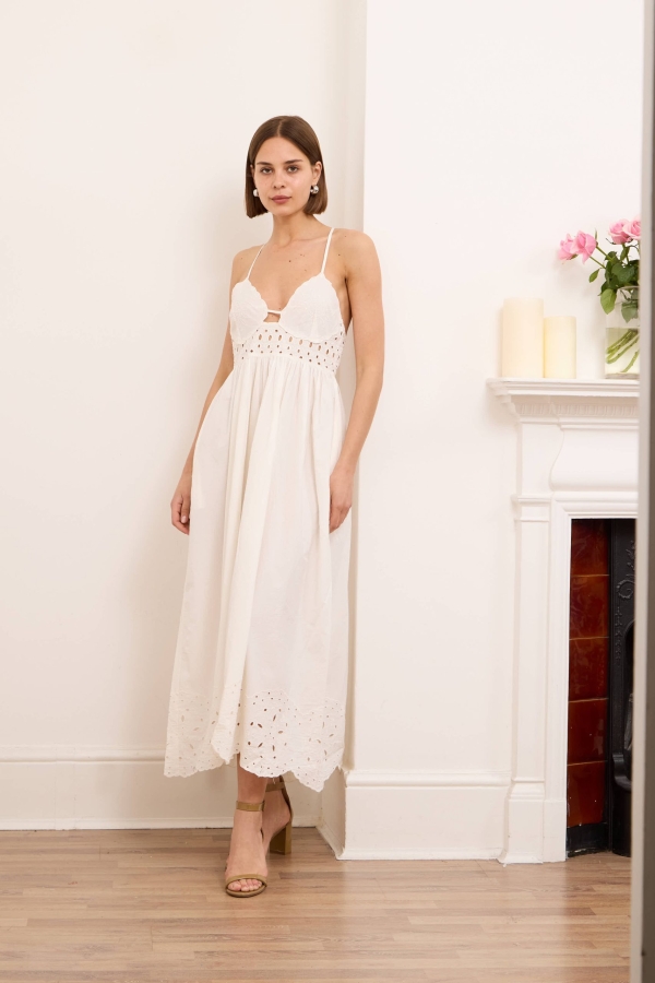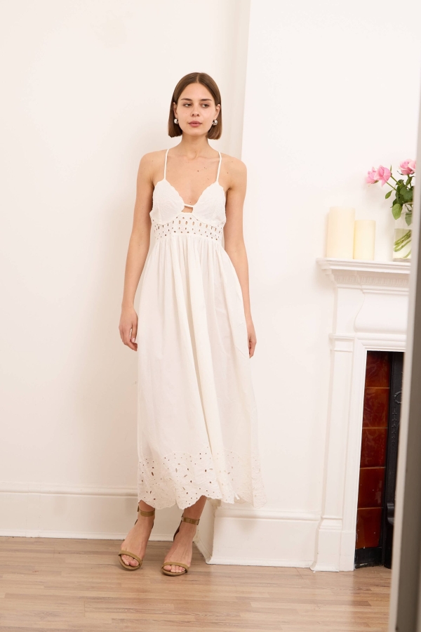 The best thing about a beautiful strappy summer dress is that you’ll never fall out of love with it. All about the broderie anglaise , Shay dress is cut from lightweight cotton , so it falls and gleams effortlessly. The plunging bodice is framed by delicate straps that expose the open back. Style yours with a red lip and sandals.