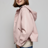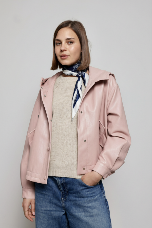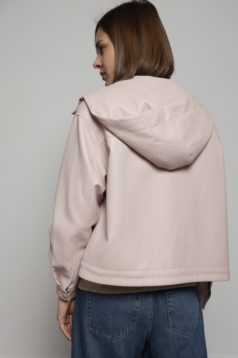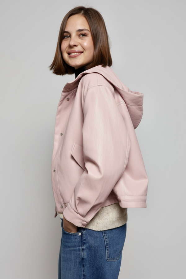 Crafted from smooth faux leather, it offers a sleek, modern look while remaining comfortable for everyday wear. The full front zip closure makes it easy to layer, while the attached hood adds a practical touch for unpredictable spring days.