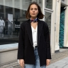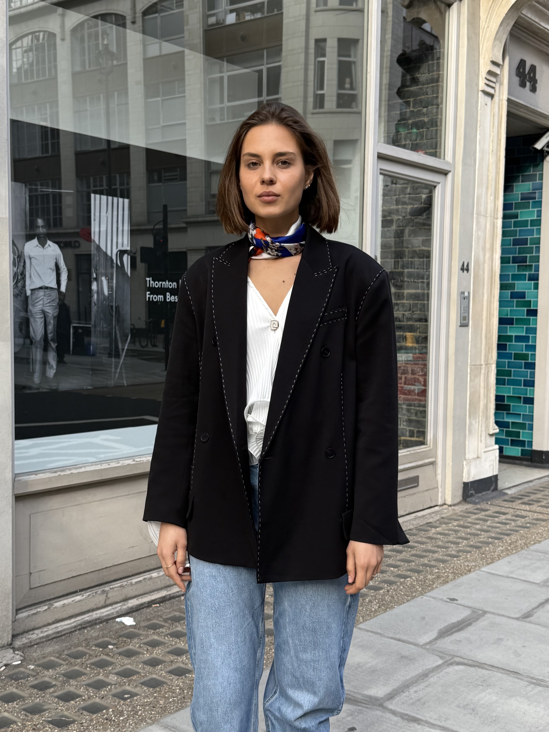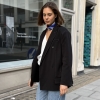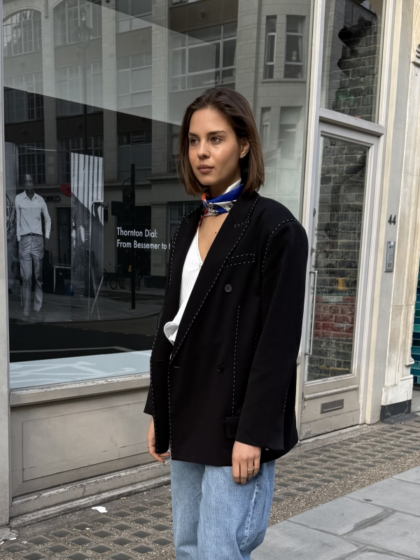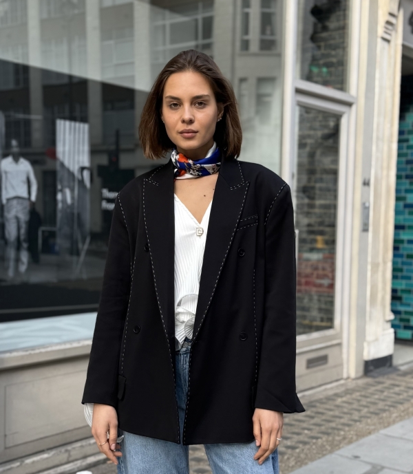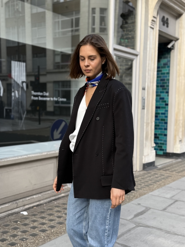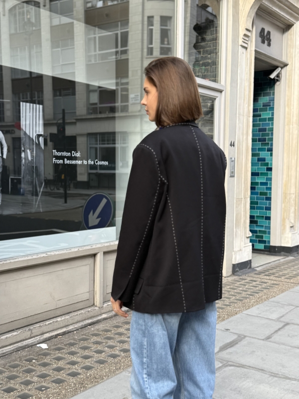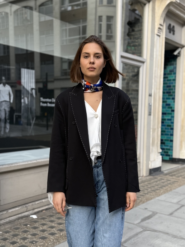 The Sienna blazer is a refined take on modern tailoring, designed in a black hue with an effortlessly oversized silhouette. Subtle contrast stitching adds a distinctive, elevated detail while maintaining a clean and versatile look. Crafted for both structure and comfort, it layers seamlessly over casual and tailored pieces alike. Whether styled with denim or coordinated separates, the Sienna blazer brings a polished yet relaxed edge to any outfit.