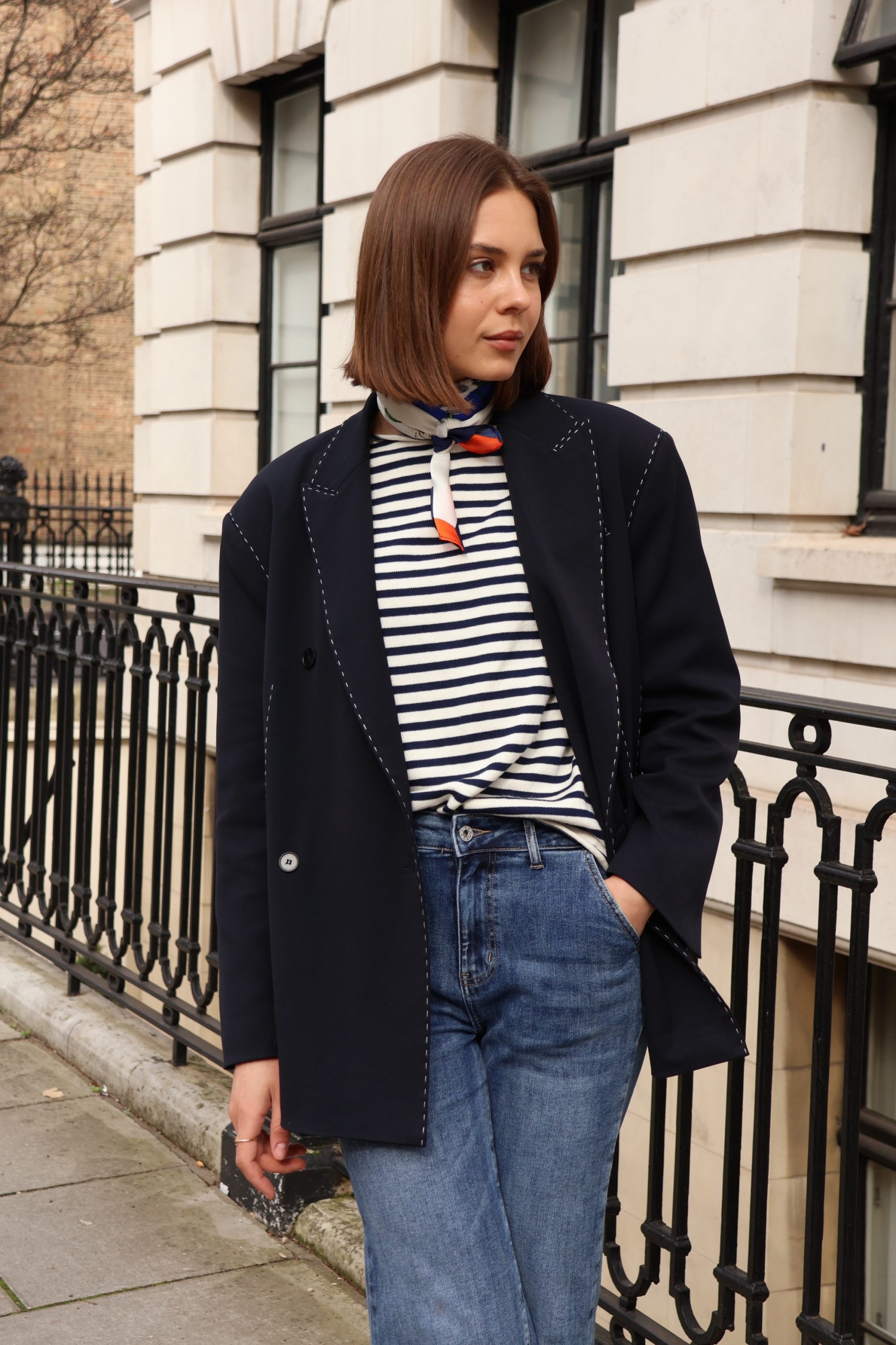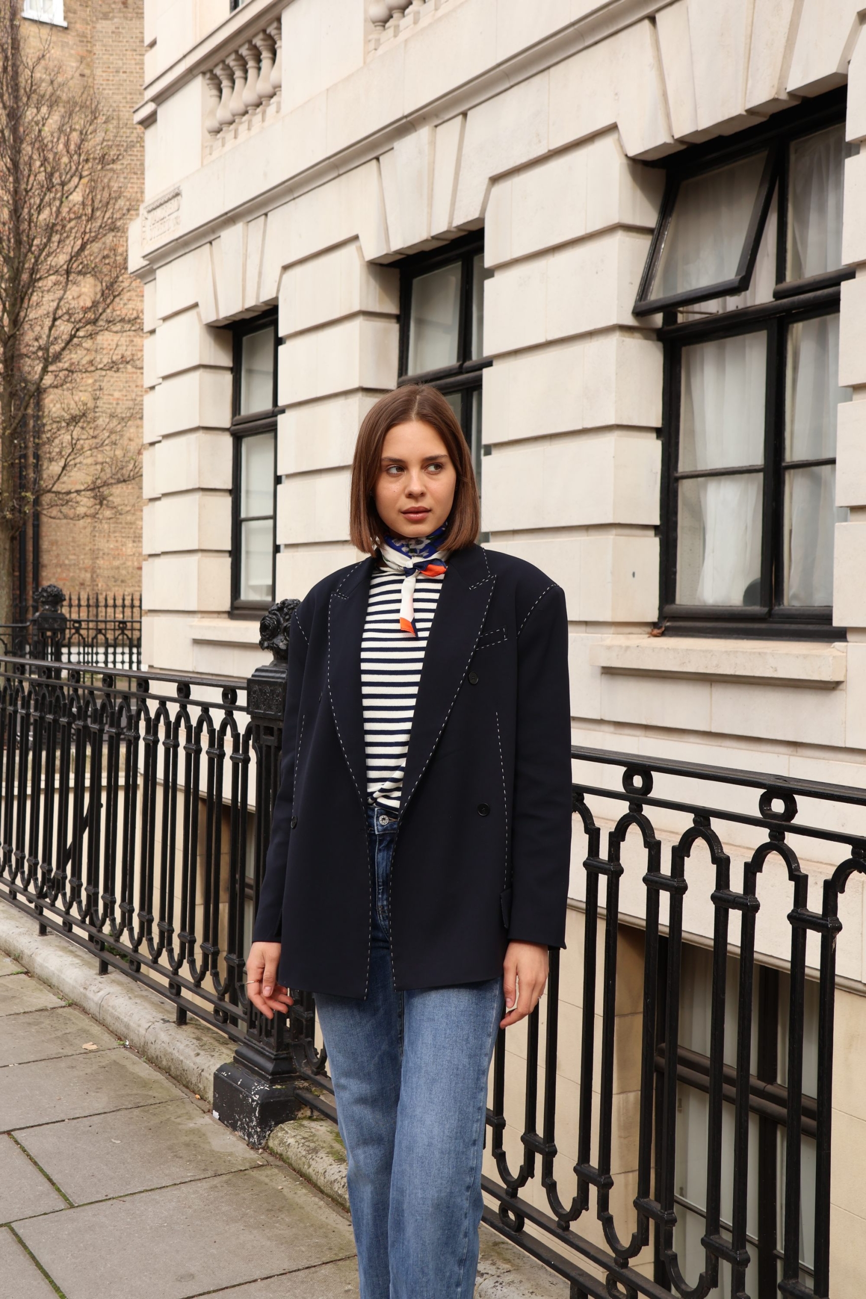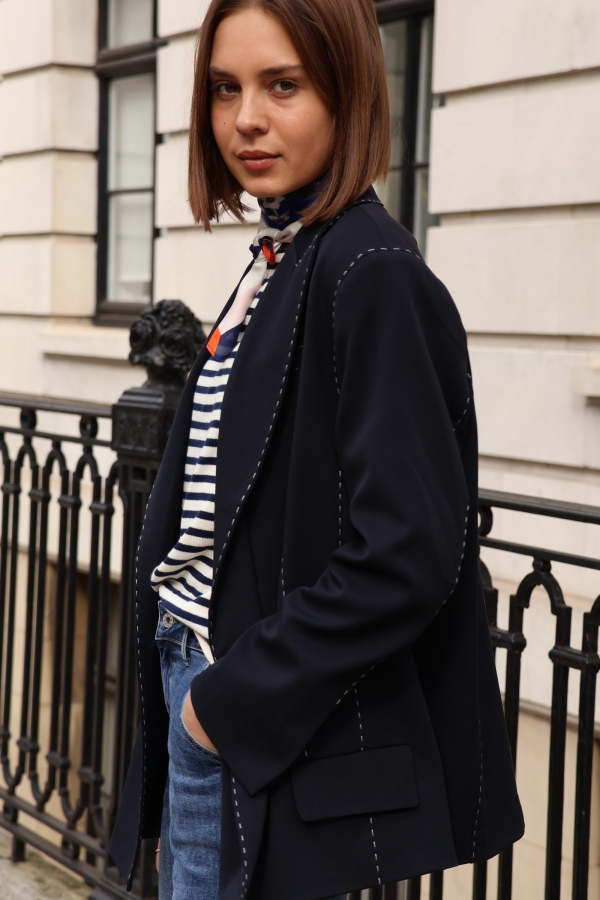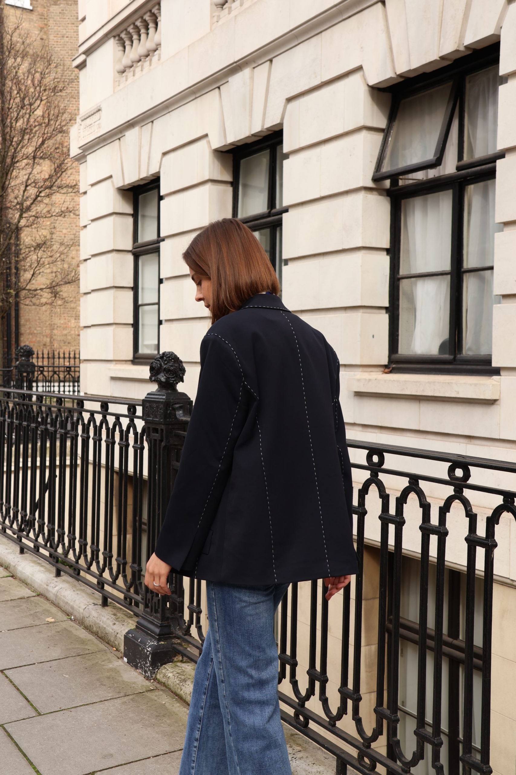 The Sienna blazer is a refined take on modern tailoring, designed in a deep navy hue with an effortlessly oversized silhouette. Subtle contrast stitching adds a distinctive, elevated detail while maintaining a clean and versatile look. Crafted for both structure and comfort, it layers seamlessly over casual and tailored pieces alike. Whether styled with denim or coordinated separates, the Sienna blazer brings a polished yet relaxed edge to any outfit.