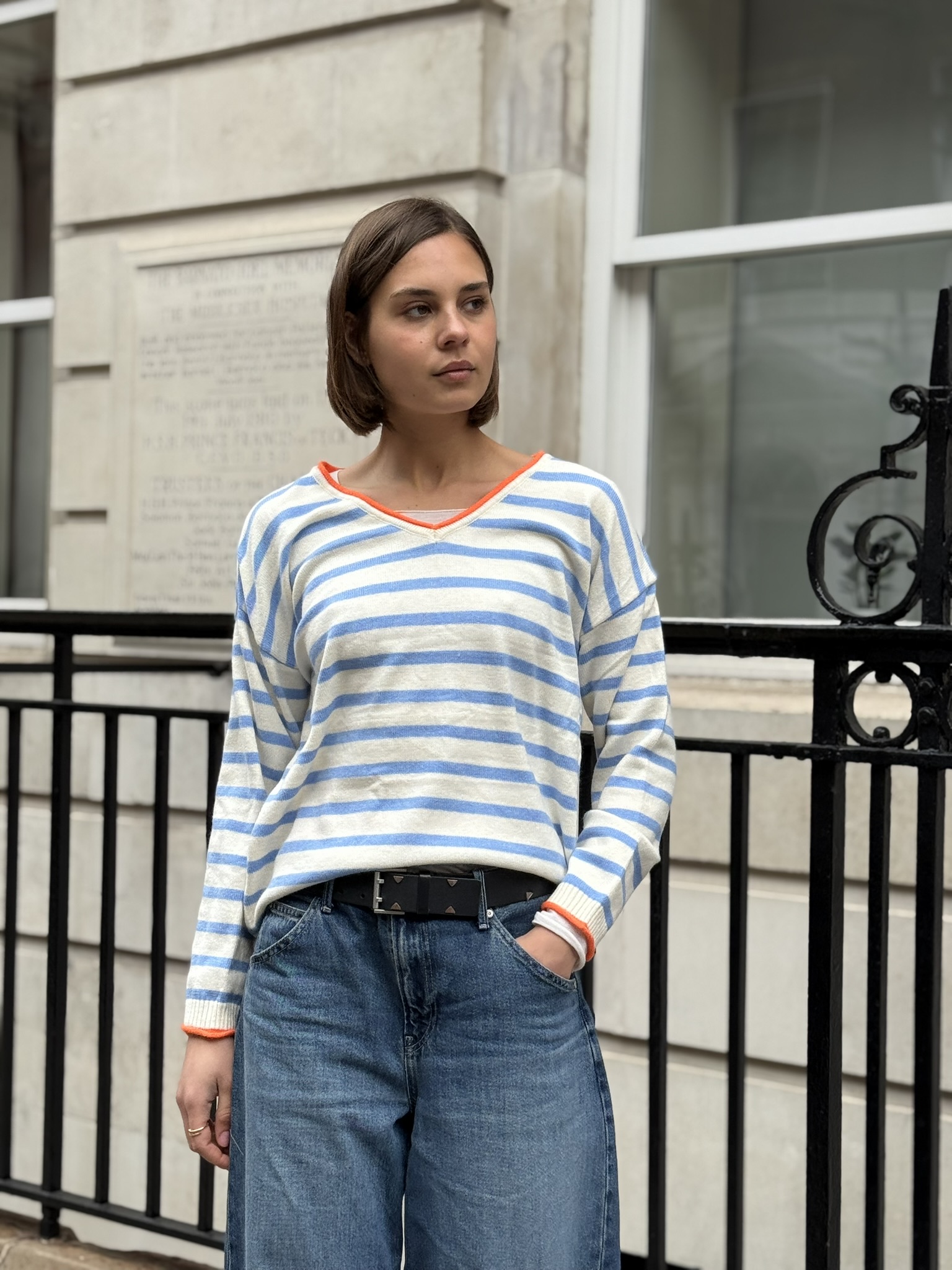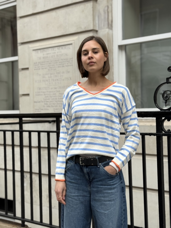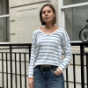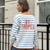 Effortlessly chic with a touch of Riviera charm, this striped V-neck sweater features classic horizontal stripes and a flattering neckline for a timeless silhouette. The statement “St. Tropez” lettering across the back adds a bold, destination-inspired detail that sets it apart. Designed in a relaxed fit for easy styling, it’s the perfect blend of casual sophistication and laid-back coastal style.