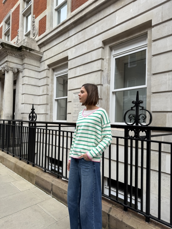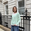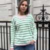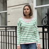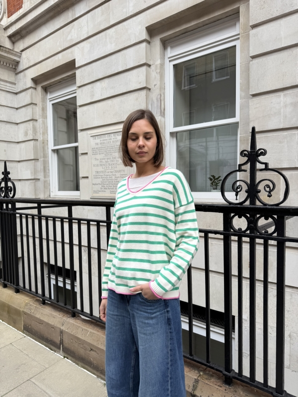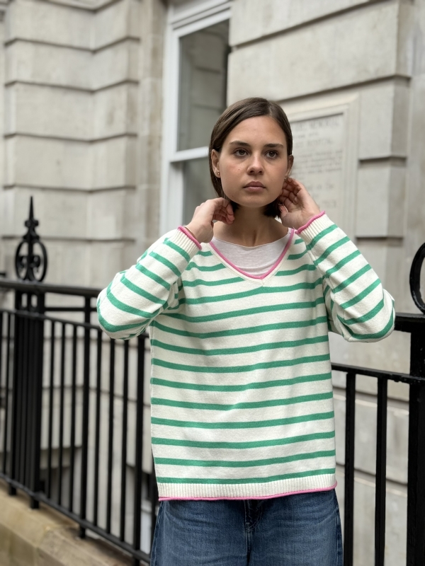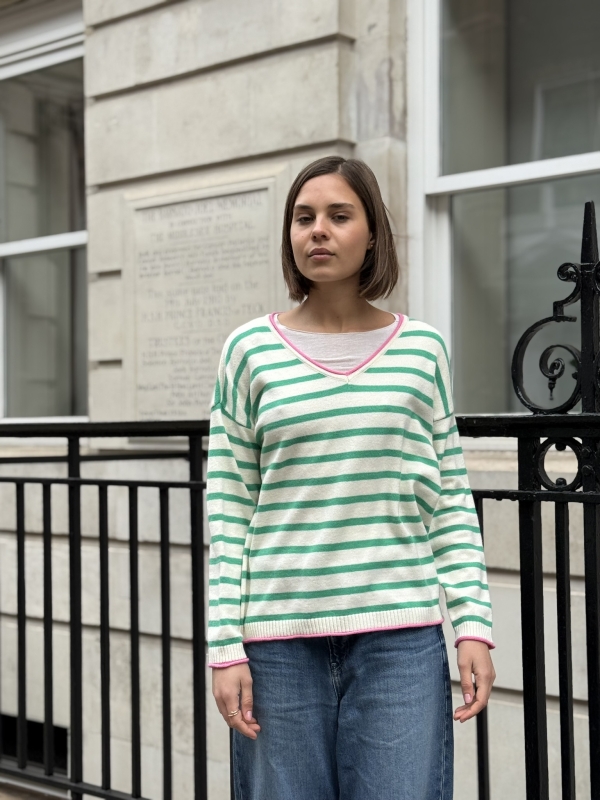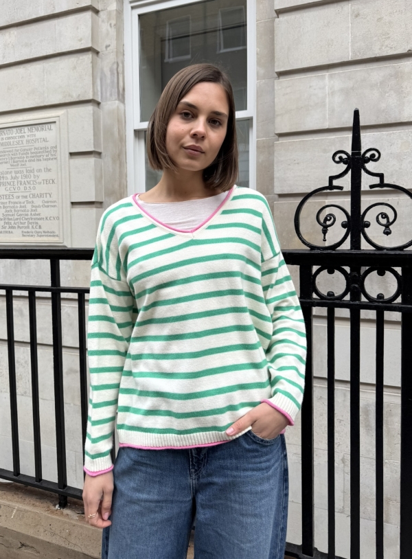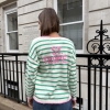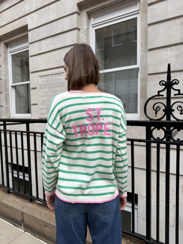 Effortlessly chic with a touch of Riviera charm, this striped V-neck sweater features classic horizontal stripes and a flattering neckline for a timeless silhouette. The statement “St. Tropez” lettering across the back adds a bold, destination-inspired detail that sets it apart. Designed in a relaxed fit for easy styling, it’s the perfect blend of casual sophistication and laid-back coastal style.