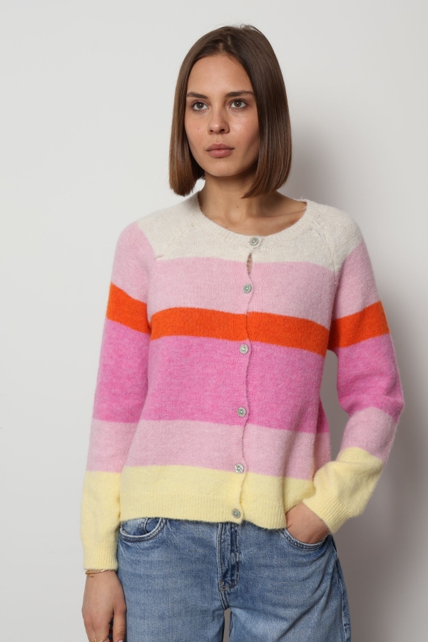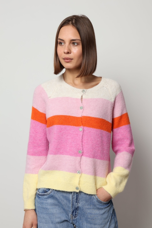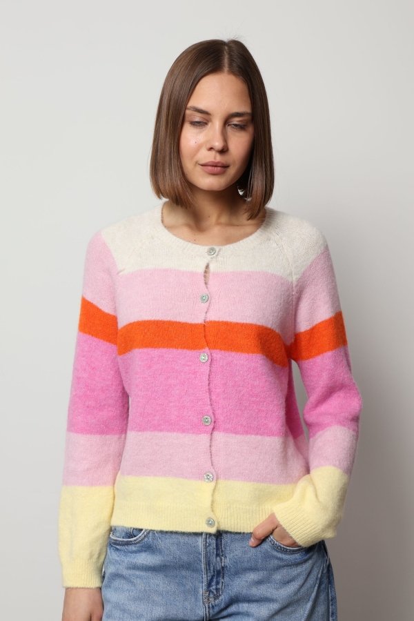 Crafted for both comfort and style, Sofia features soft knit fabric and a classic button-front design, making it easy to layer over your favourite tops and dresses. The colourful stripes create a playful yet modern look, perfect for brightening everyday wear.