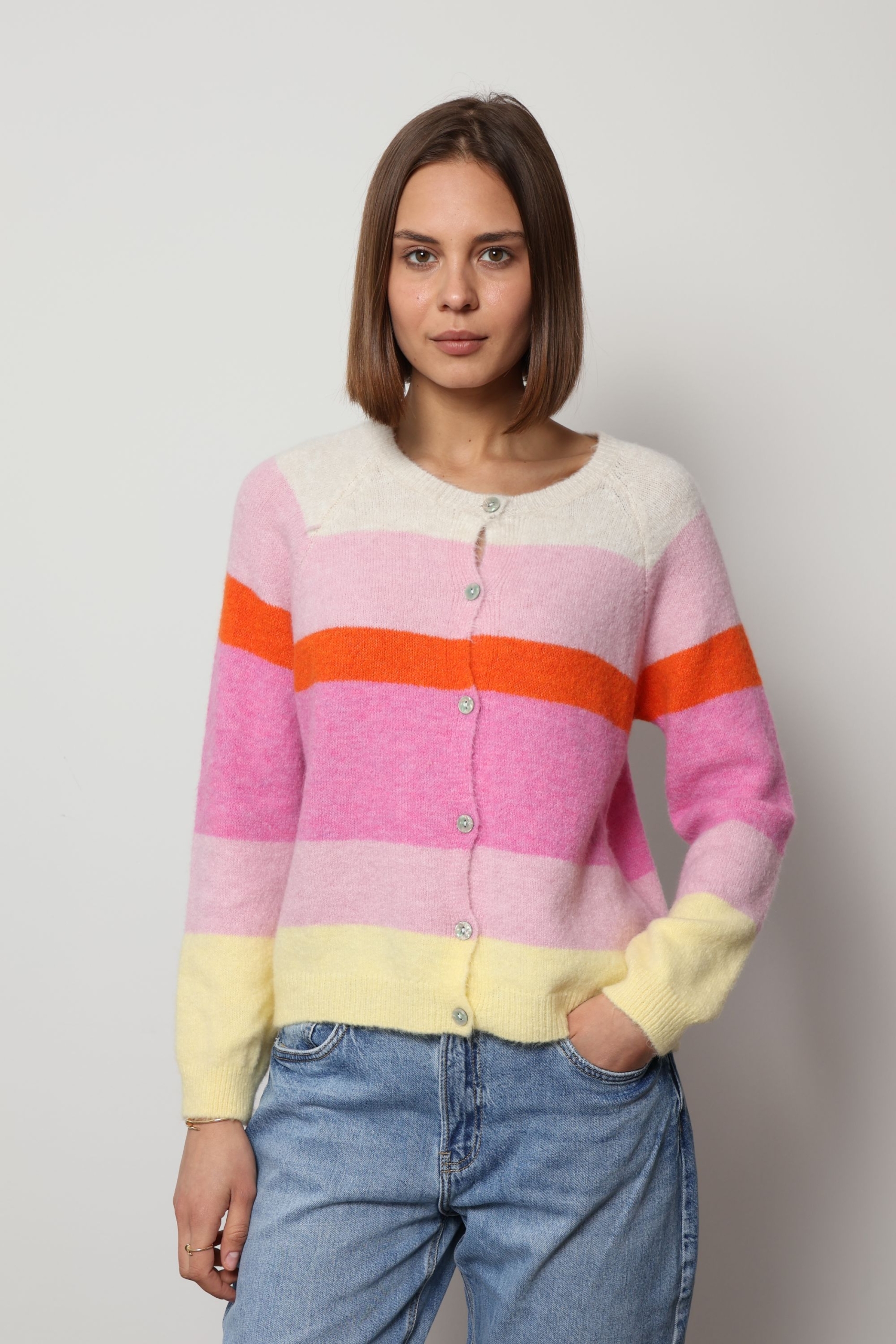 Meet Sofia, the cardigan that instantly lifts your mood. Designed with a bold blocked stripe pattern and a very happy, vibrant colour palette, this cardigan brings energy and personality to any outfit.