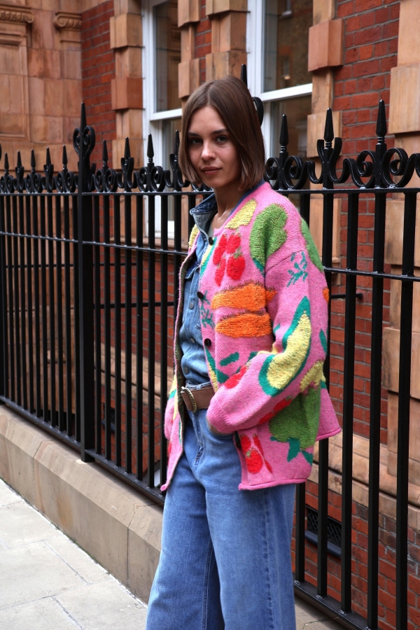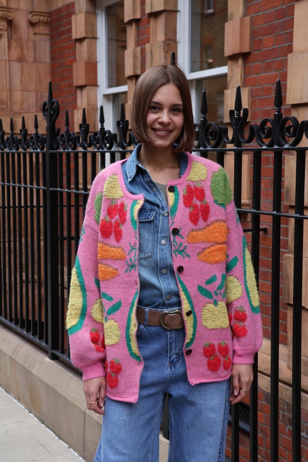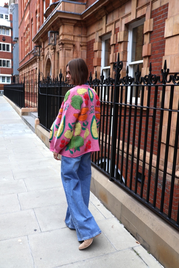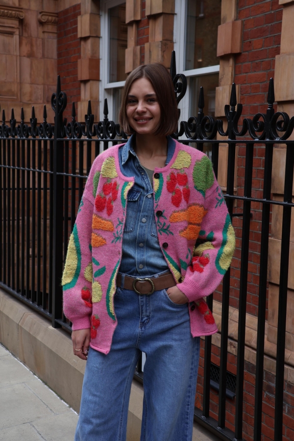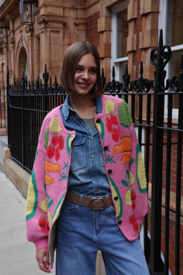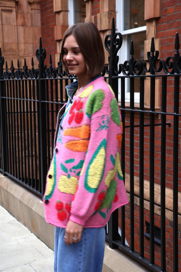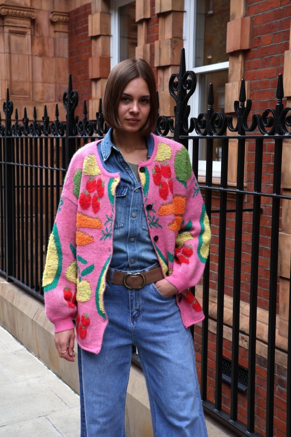 Stella cardigan is jacquard-knitted with colourful flowers and geometric shapes that give it an instantly bohemian feel. It’s made from a soft, cosy blend of acrylic. It’s designed for a loose fit . Slip it on over a tank and leave it undone at the hem for a laid-back take. It has a loose silhouette that’s perfect for layering. The spring hue will coordinate well with denim and floral-print dresses alike.