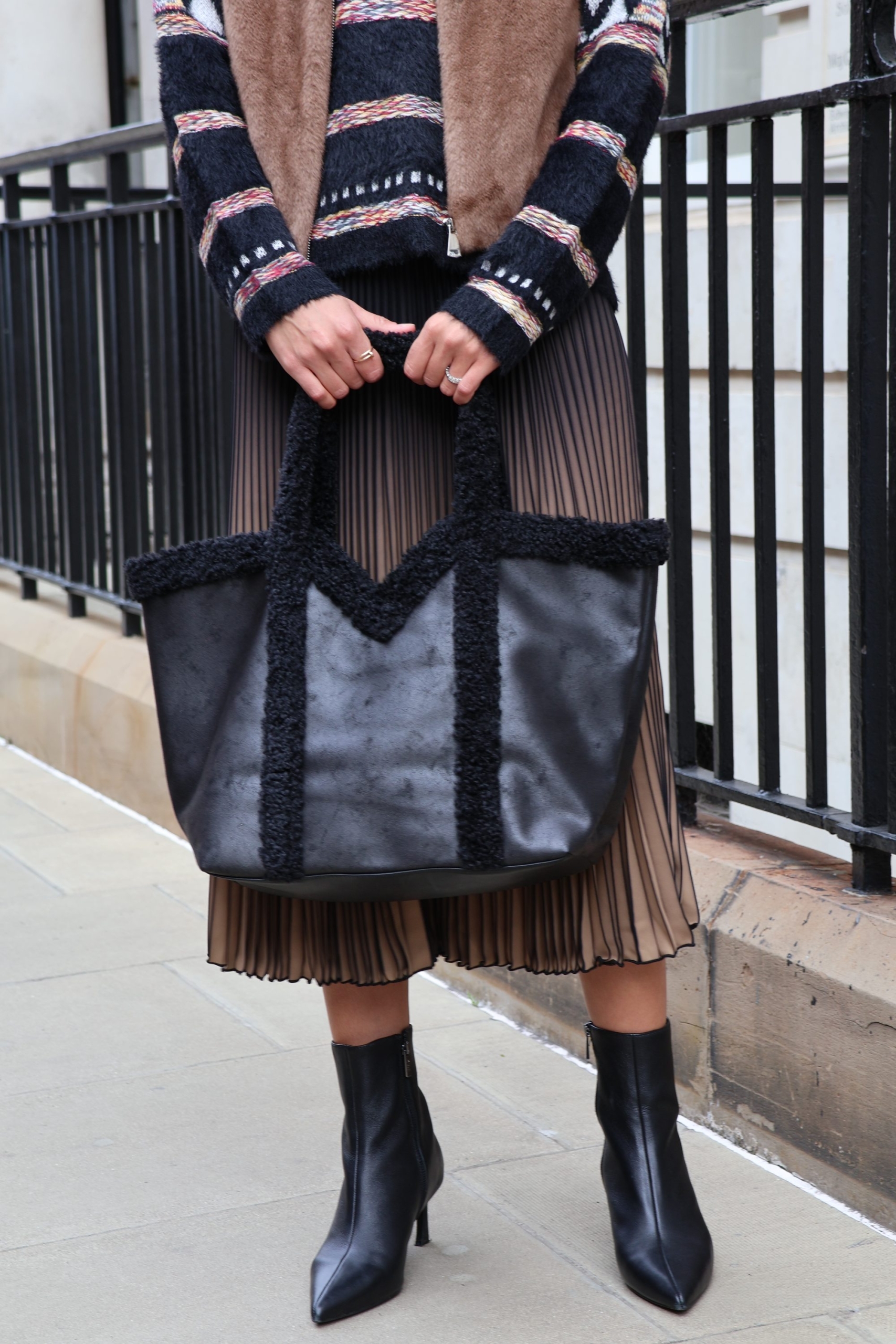The tote silhouette bag is made from faux fur and it is compact enough to keep your everyday essentials organised. The Tara bag is stylish addition to your wardrobe. There’s a zipped pocket inside, which will keep your apartment key and lipstick from floating around.