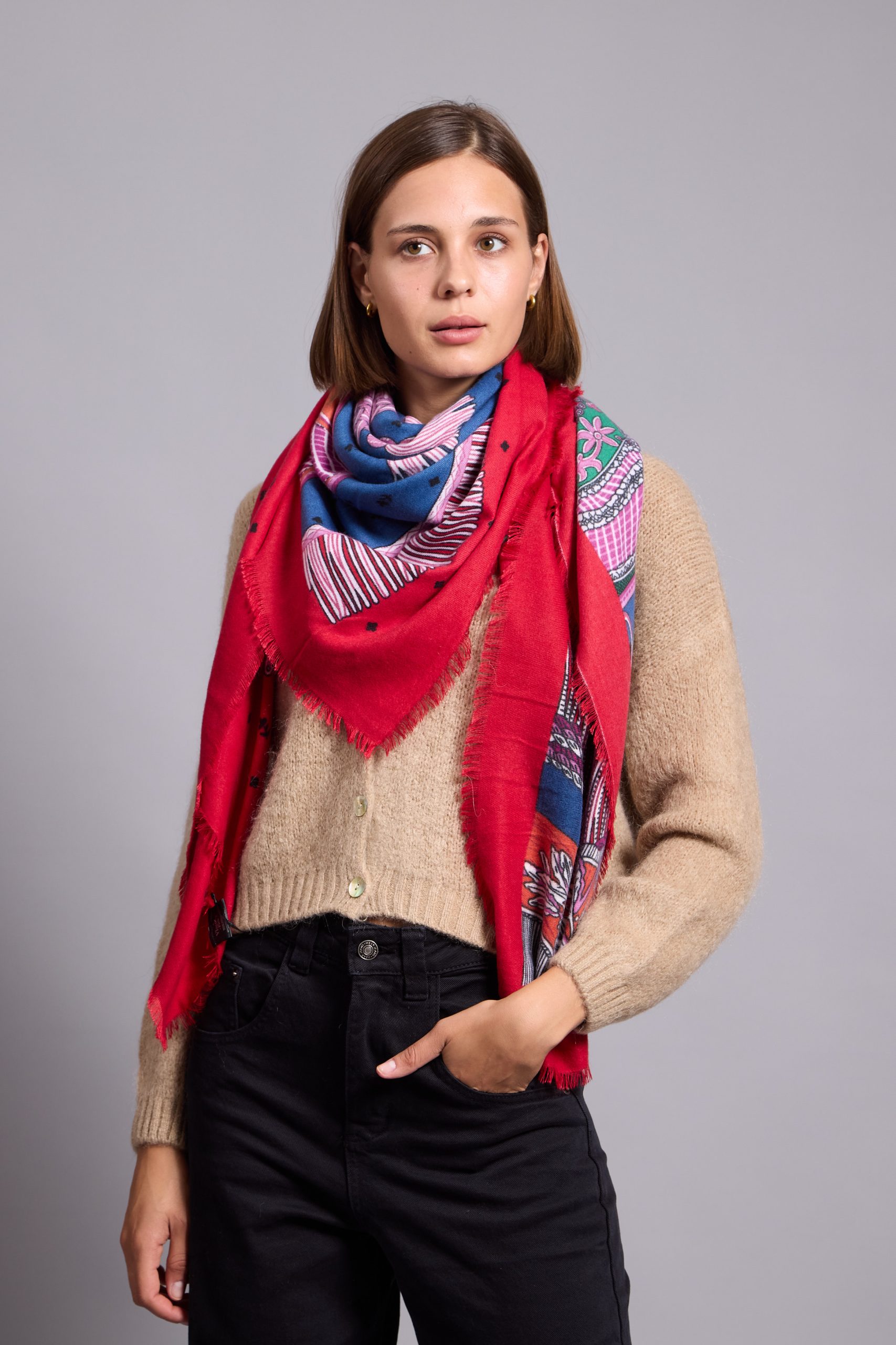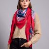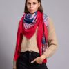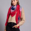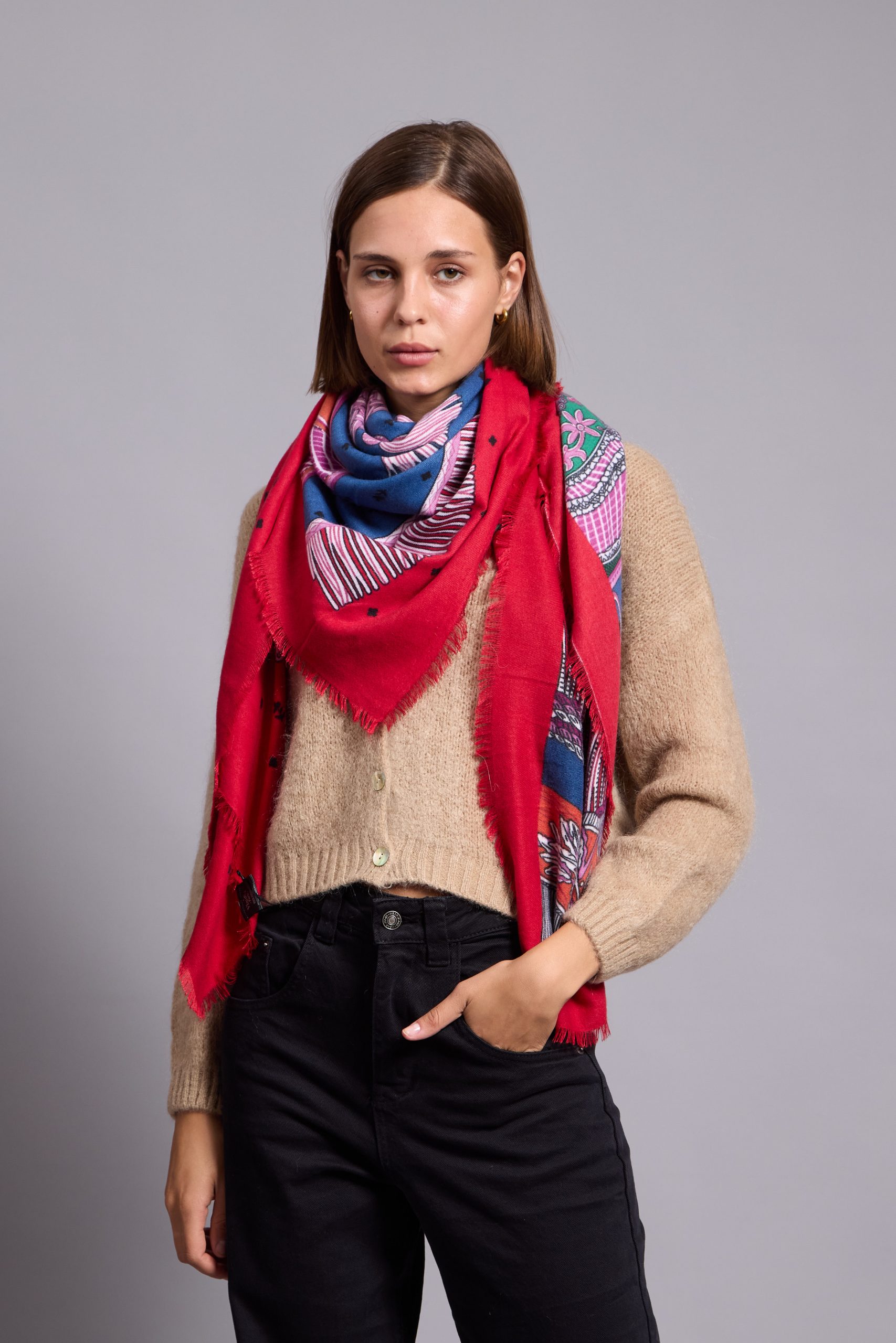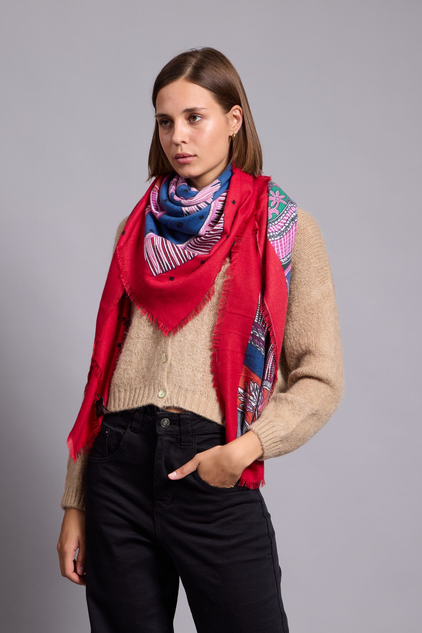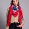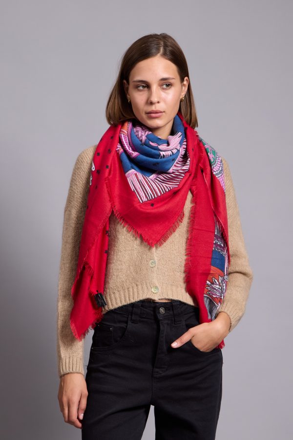 The scarf has been woven from a light blend of soft viscose and wool blend . Set against a neutral backdrop, in an array of colours and has delicately frayed edges. Style it wrapped loosely around your neck or draped over your shoulders.